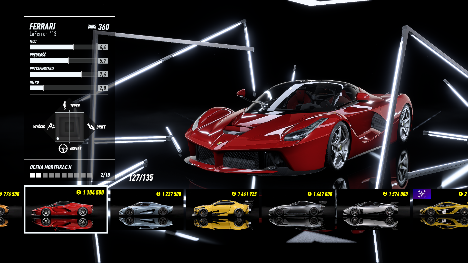 | Ferrari LaFerrari | 2013 | Hipersamochód | 360 | 1,104,500 | 949 | 1321 | 2/10 | Osiągnij 40 poziom REP | Podstawowa wersja gry | |