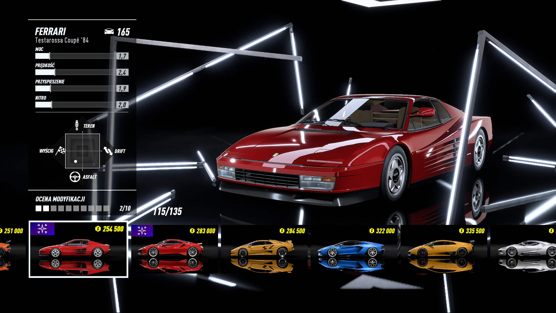 | Ferrari Testarossa Coupé | 1984 | Supersamochód | 165 | 254,500 | 385 | 1204 | 2/10 | Osiągnij 12 poziom REP | Podstawowa wersja gry | |