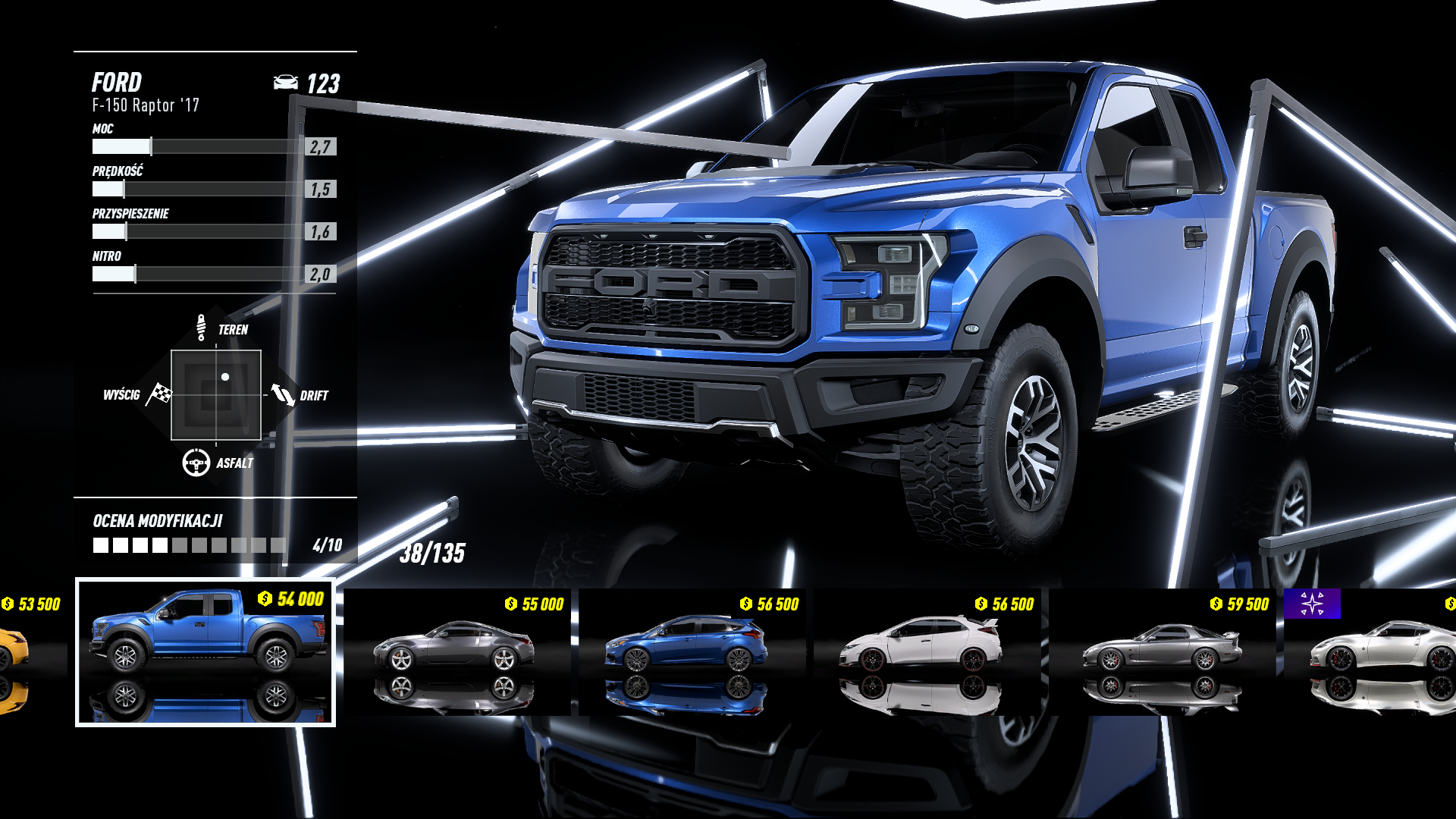 | Ford F-150 Raptor | 2017 | Pick-up | 123 | 54,000 | 440 | 913 | 4/10 | Osiągnij 20 poziom REP | Podstawowa wersja gry | |