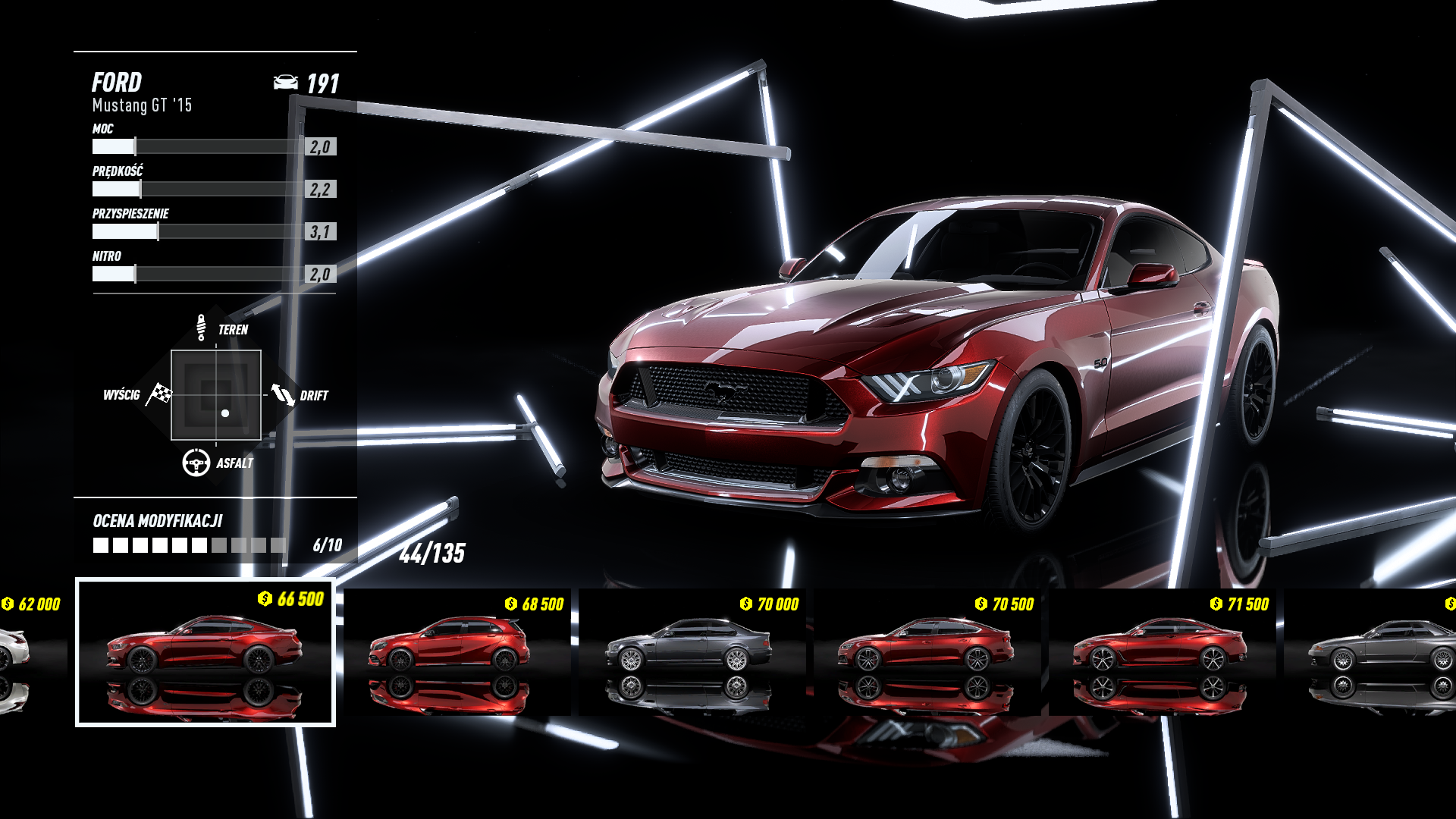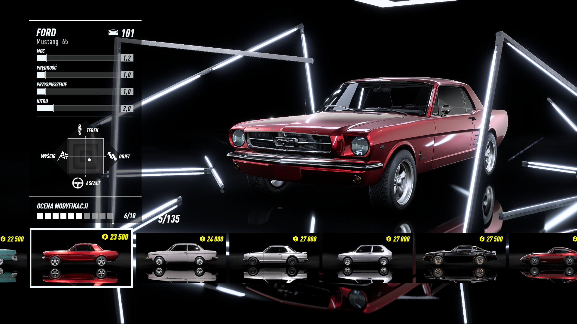 | Ford Mustang | 1965 | Klasyczny | 101 | 23,500 | 254 | 1163 | 6/10 | Osiągnij 12 poziom REP | Podstawowa wersja gry | |