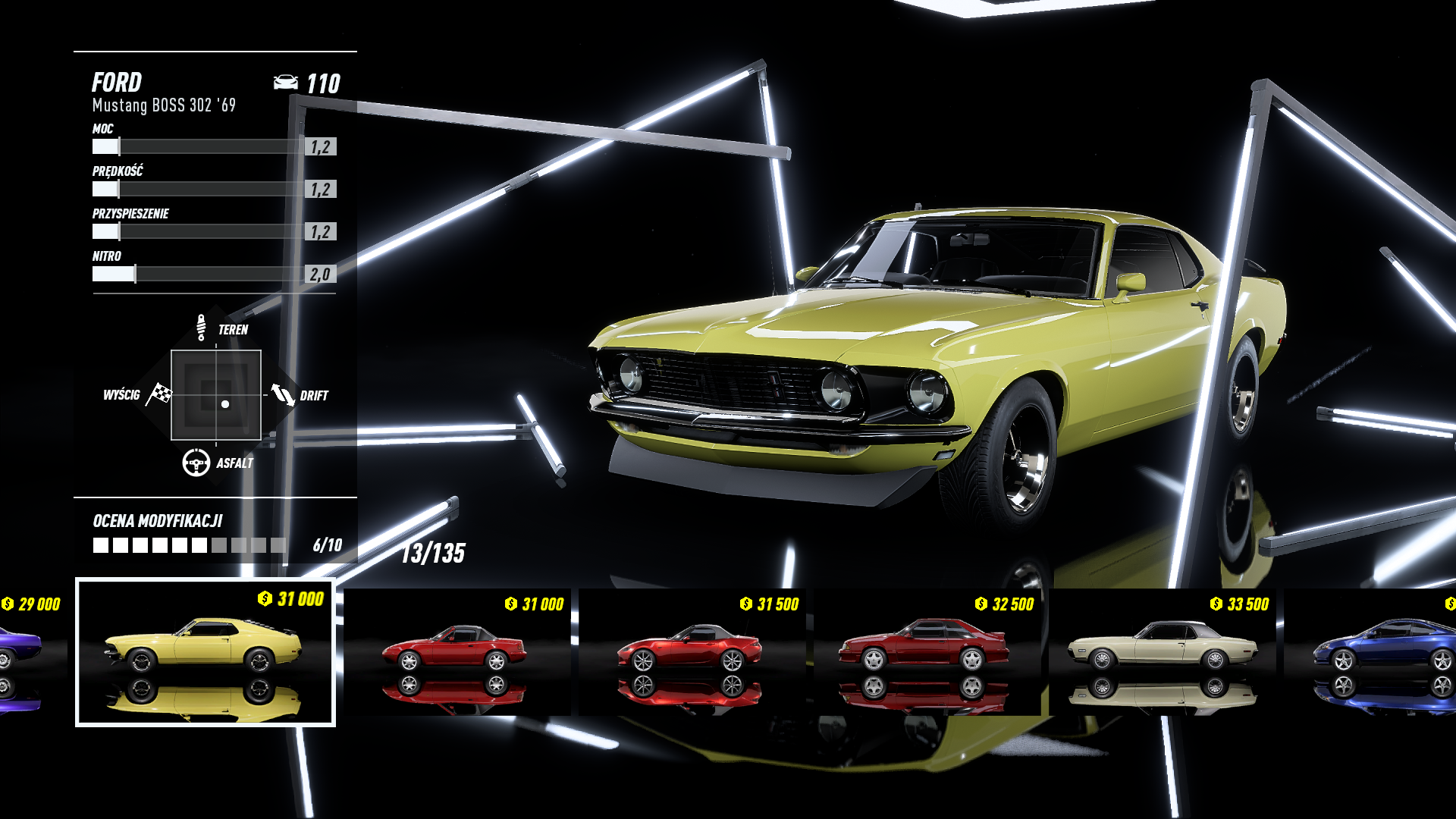 | Ford Mustang BOSS 302 | 1969 | Klasyczny | 110 | 31,000 | 290 | 1205 | 6/10 | Osiągnij 12 poziom REP | Podstawowa wersja gry | |