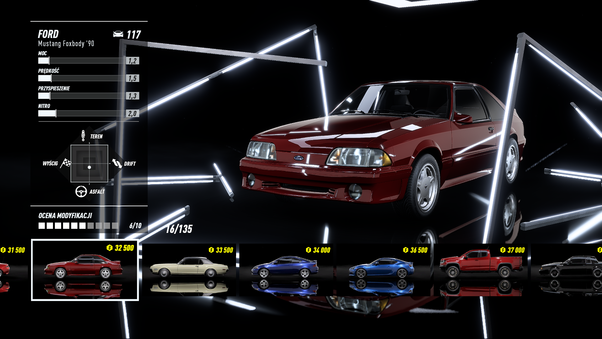 | Ford Mustang Foxbody | 1990 | Muscle car | 117 | 32,500 | 225 | 1206 | 6/10 | Osiągnij 20 poziom REP | Podstawowa wersja gry | |