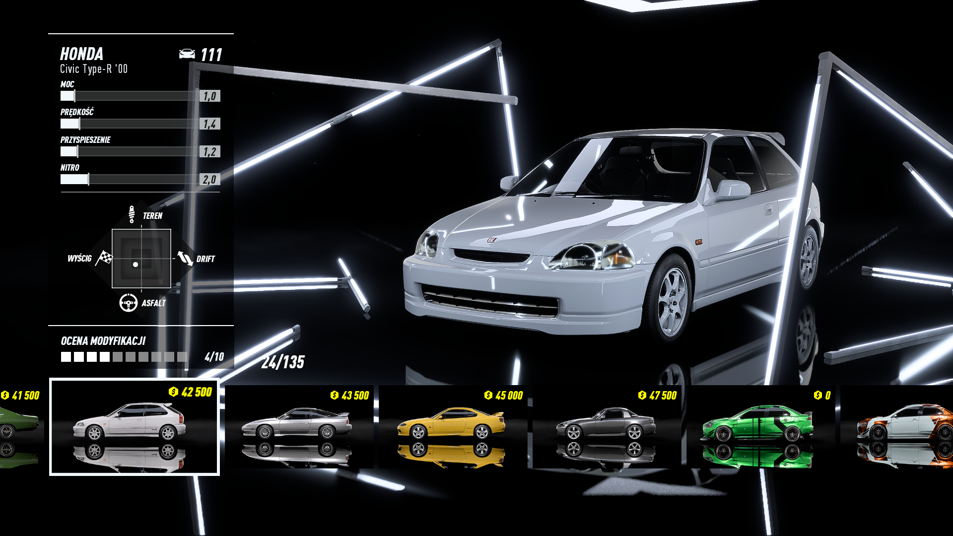 | Honda Civic Type-R | 2000 | Hot hatch | 111 | 42,500 | 182 | 489 | 4/10 | Osiągnij 20 poziom REP | Podstawowa wersja gry | |