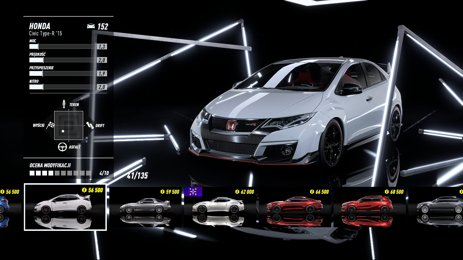 | Honda Civic Type-R | 2015 | Hot hatch | 152 | 56,500 | 306 | 583 | 4/10 | Osiągnij 5 poziom REP | Podstawowa wersja gry | |