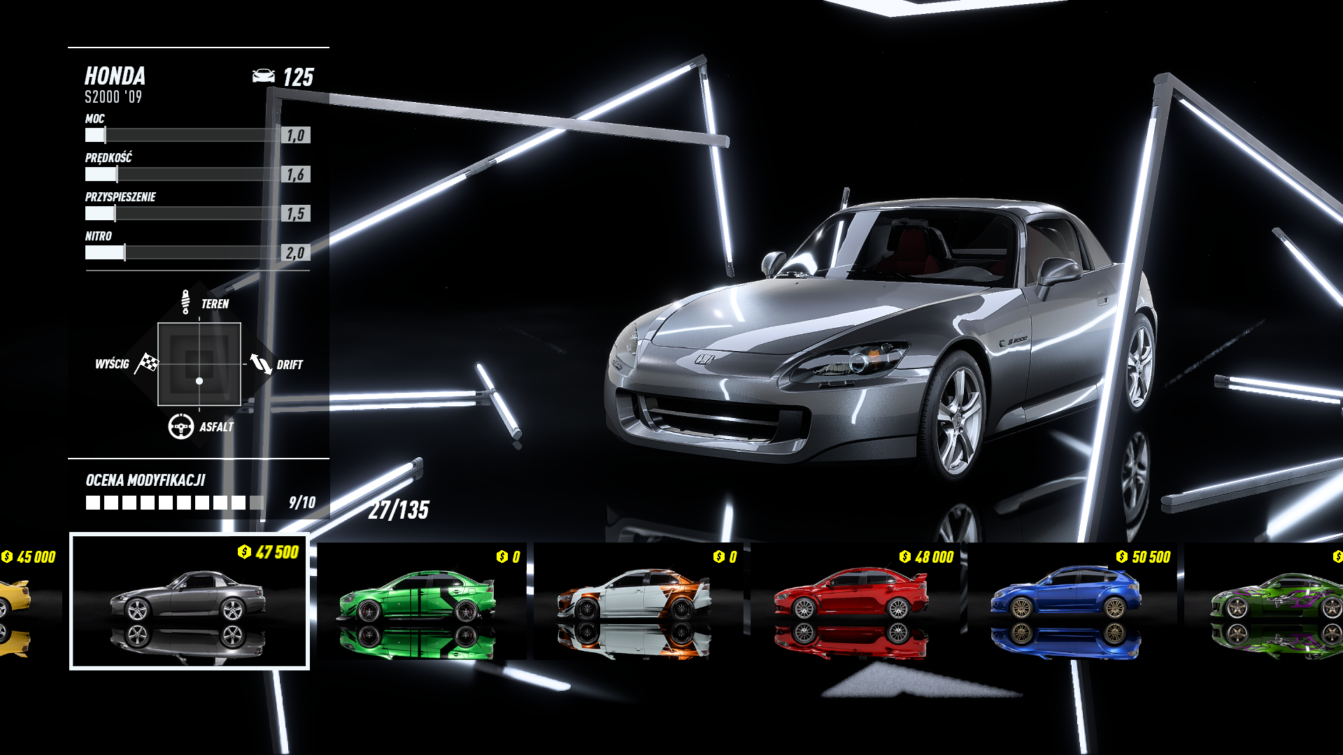| Honda S2000 | 2009 | Kabriolet | 125 | 47,500 | 237 | 583 | 9/10 | Osiągnij 20 poziom REP | Podstawowa wersja gry | |