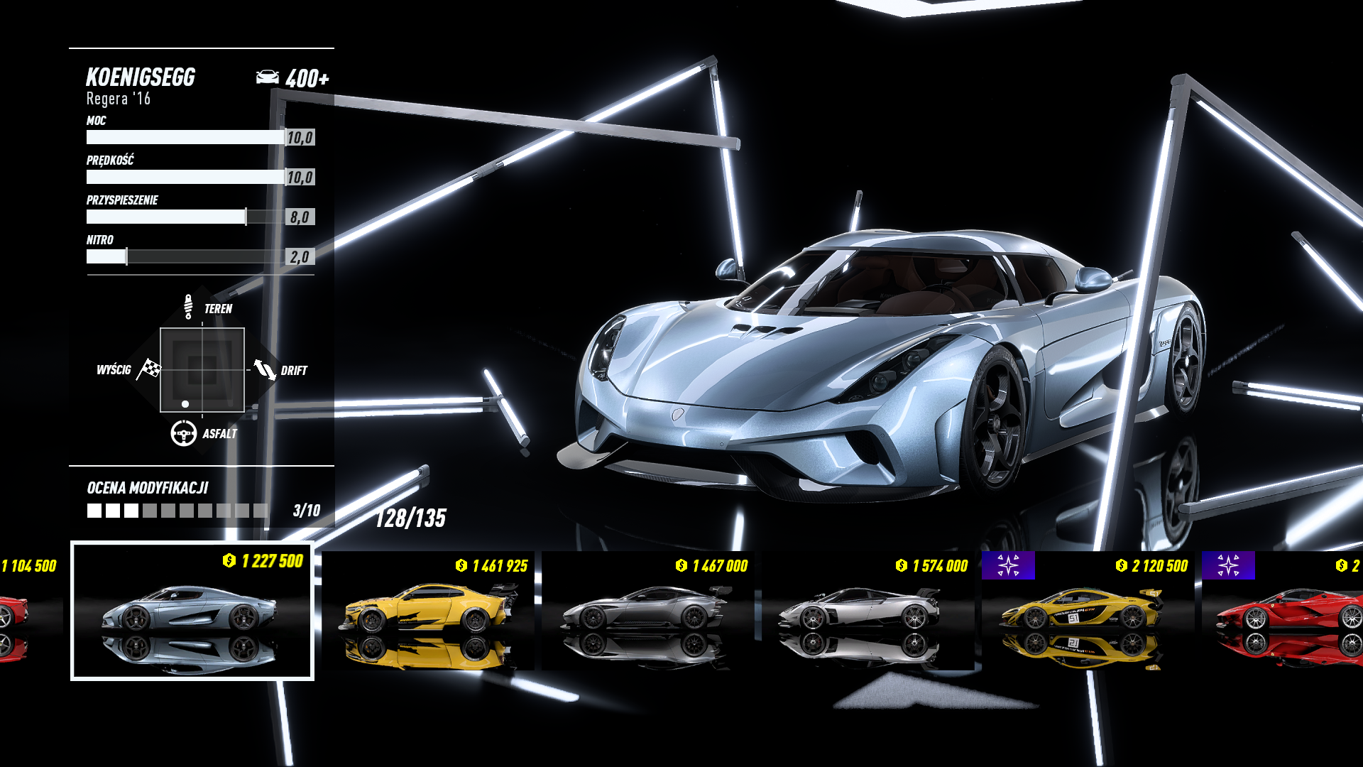 | Koenigsegg Regera | 2016 | Hipersamochód | 400+ | 1,227,500 | 1500 | 1500 | 3/10 | Osiągnij 50 poziom REP | Podstawowa wersja gry | |