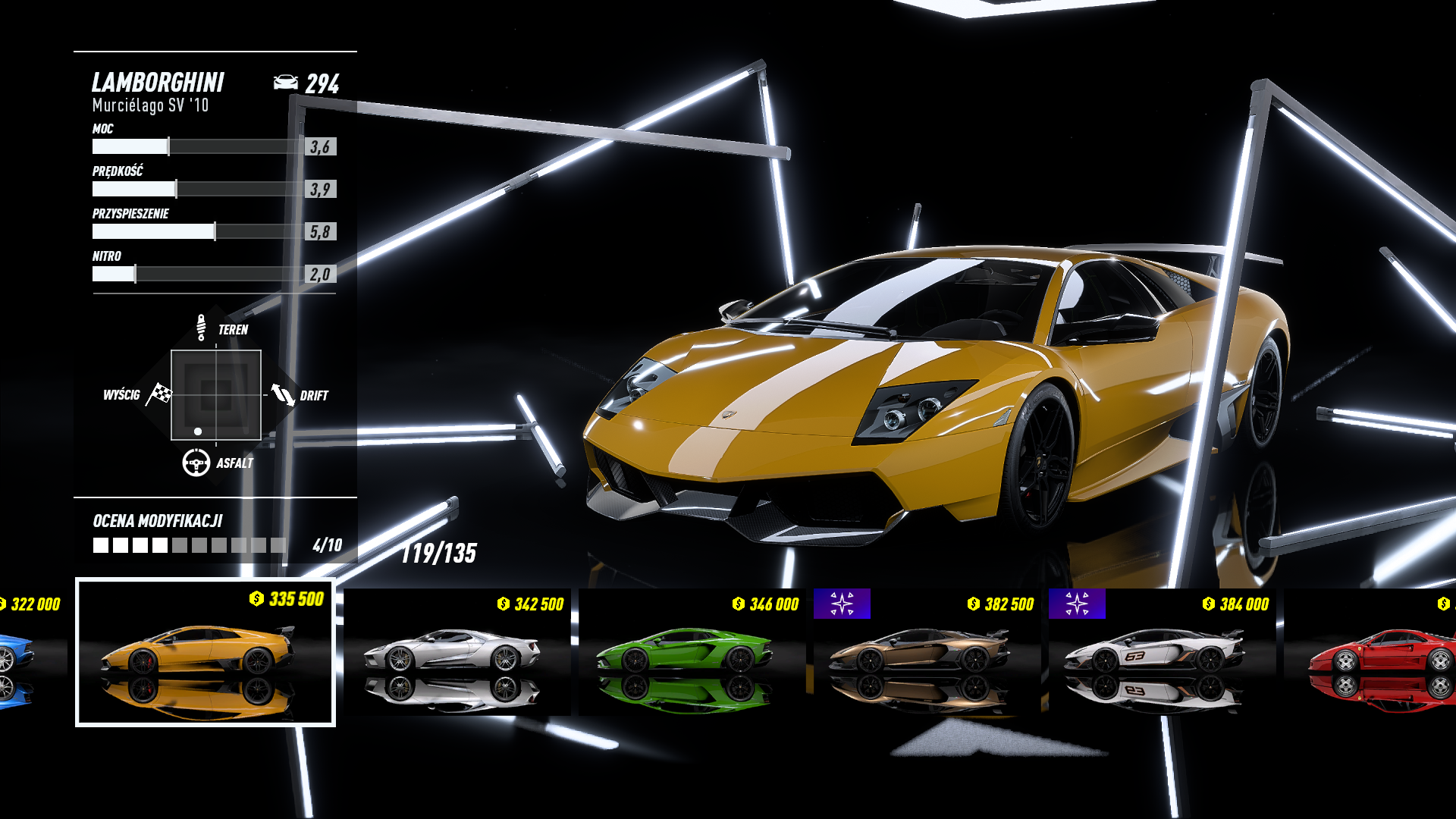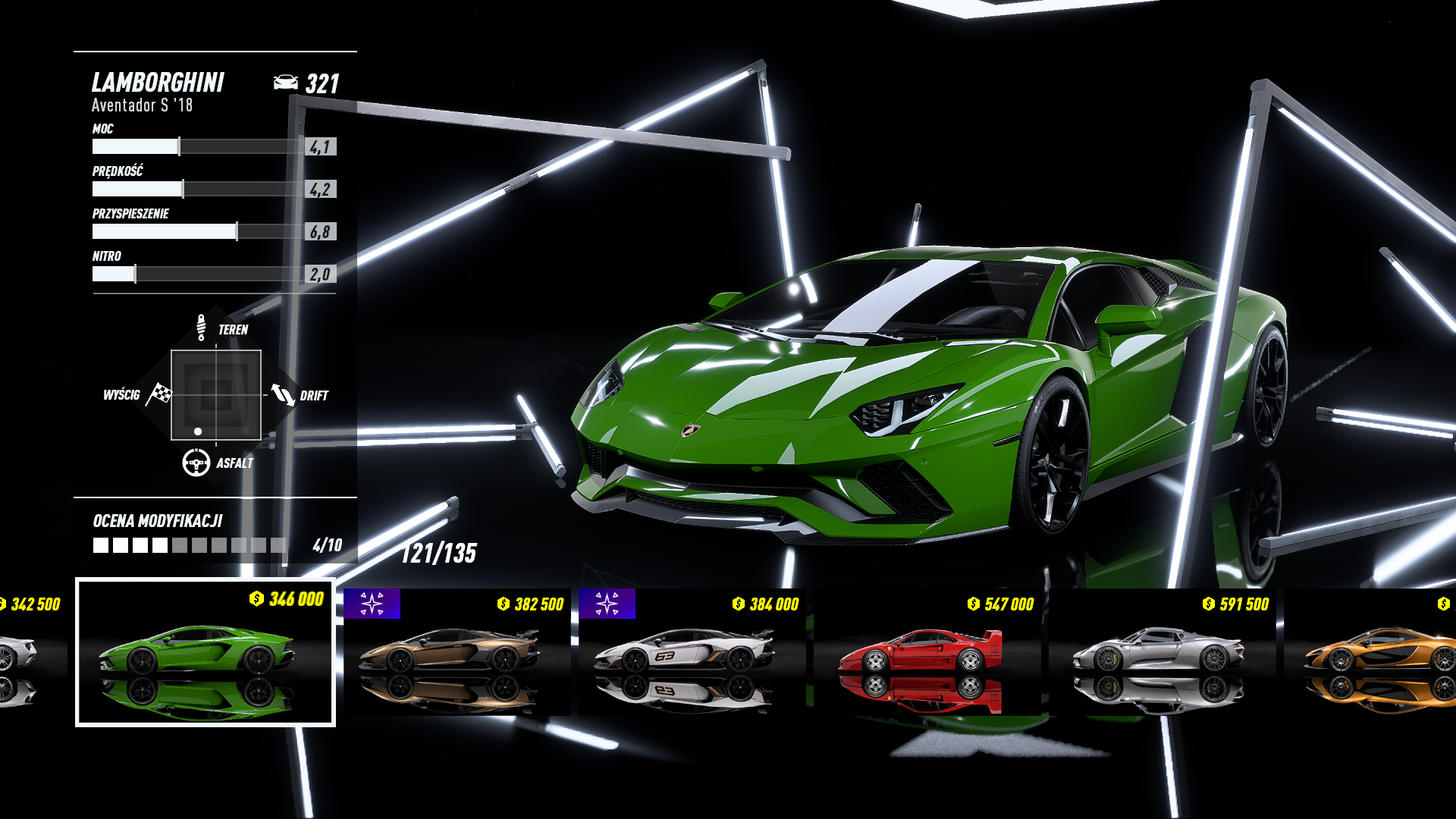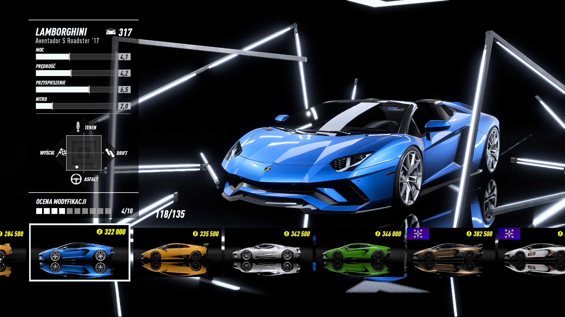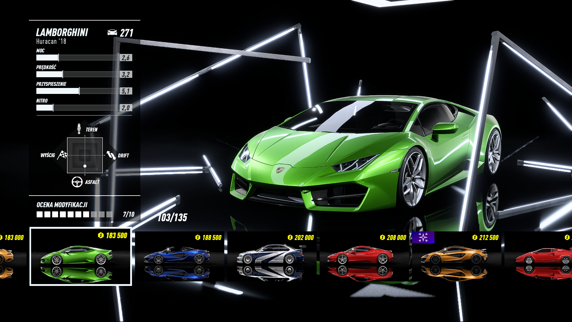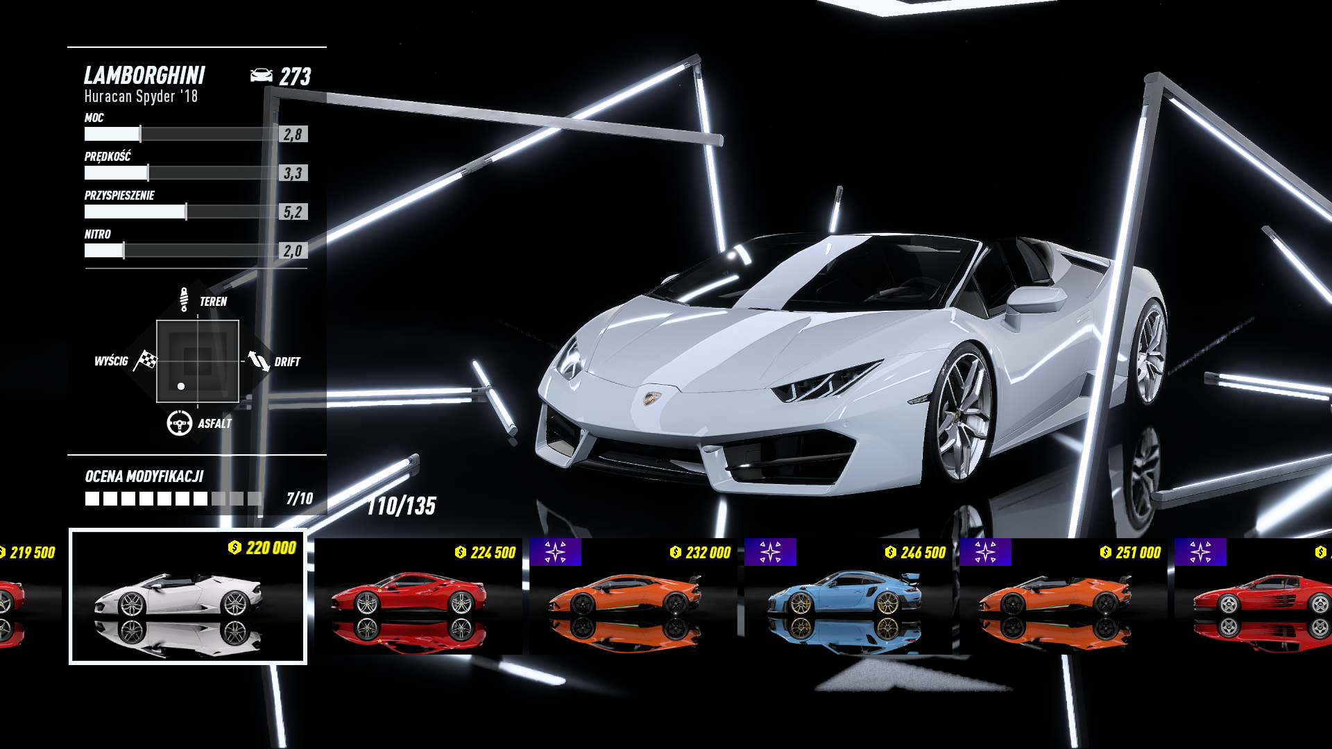 | Lamborghini Huracan | 2018 | Supersamochód | 271 | 183,500 | 572 | 1227 | 7/10 | Osiągnij 24 poziom REP | Podstawowa wersja gry | |