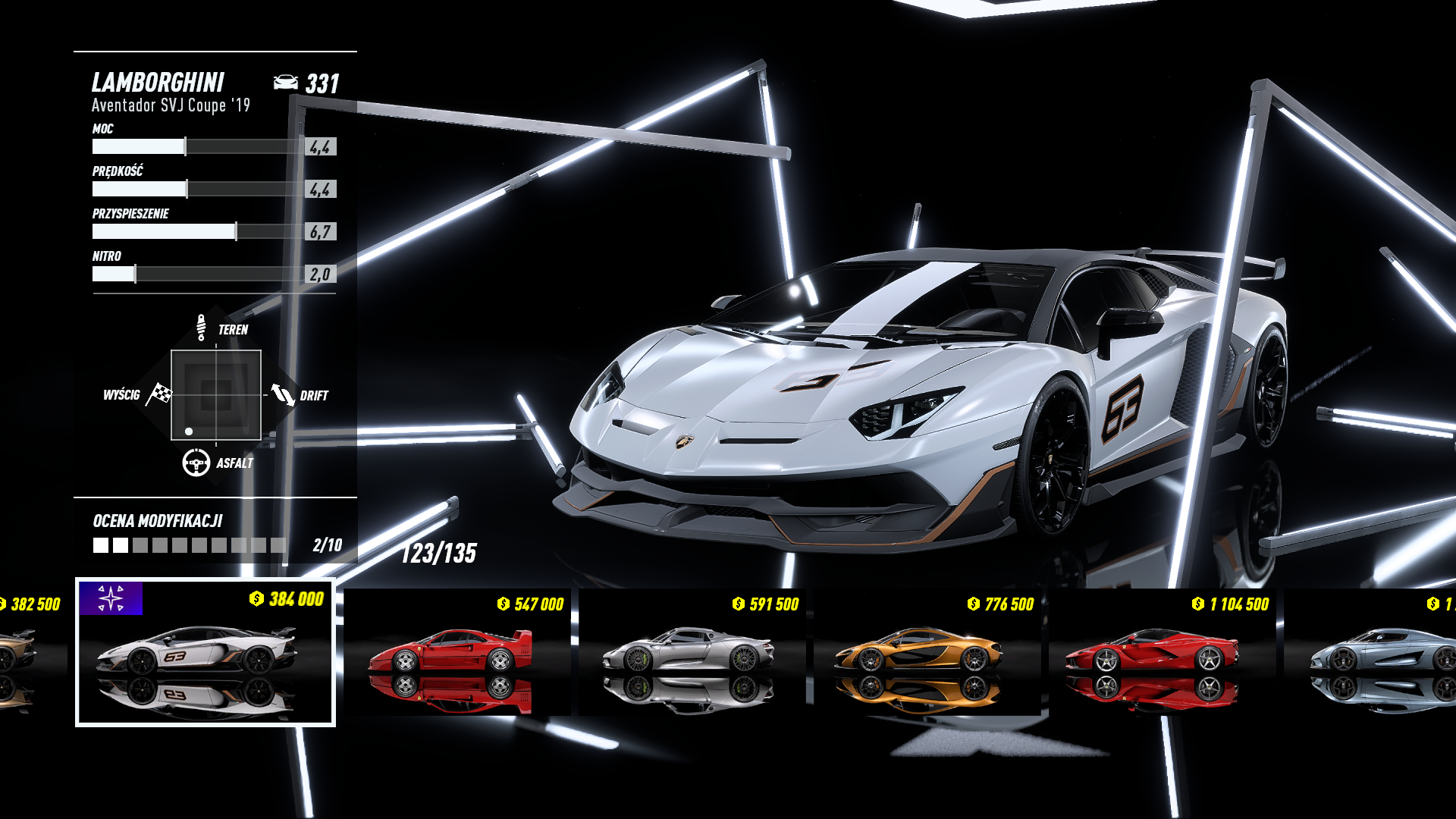 | Lamborghini Aventador SVJ Coupé | 2019 | Supersamochód | 331 | 384,000 | 759 | 1238 | 2/10 | Osiągnij 36 poziom REP | Podstawowa wersja gry | |