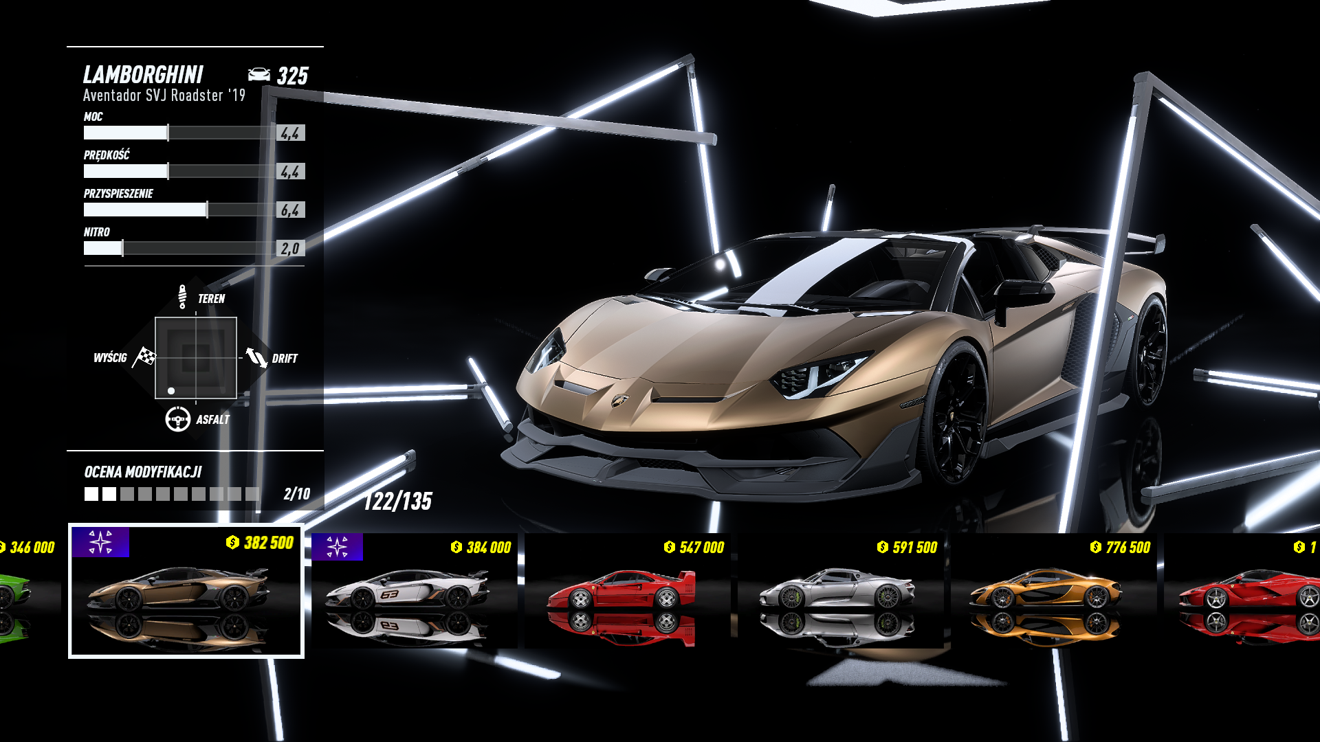 | Lamborghini Aventador SVJ Roadster | 2019 | Kabriolet | 325 | 382,500 | 759 | 1238 | 2/10 | Osiągnij 36 poziom REP | Podstawowa wersja gry | |