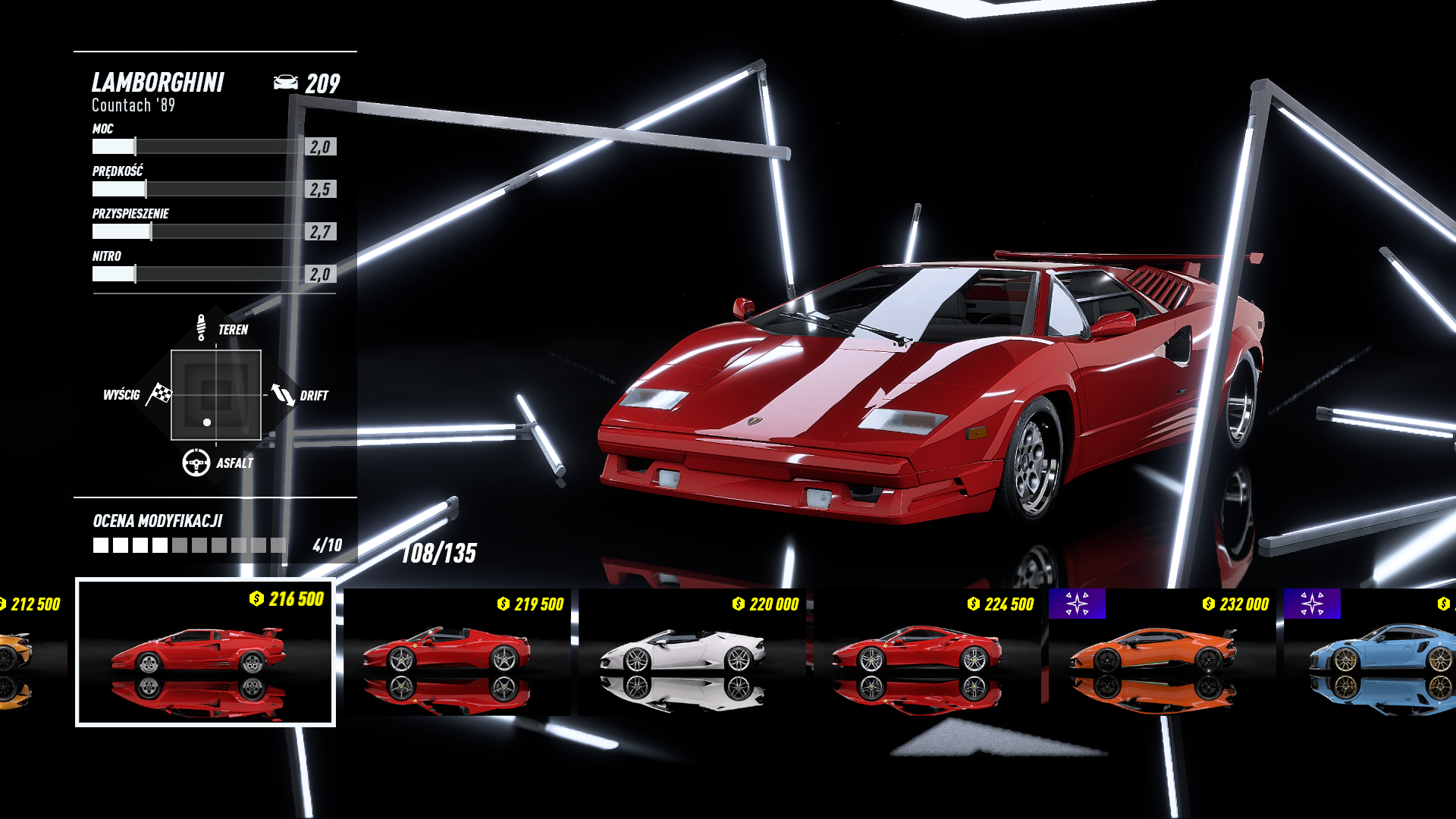 | Lamborghini Countach | 1989 | Supersamochód | 209 | 216,500 | 449 | 1239 | 4/10 | Osiągnij 18 poziom REP | Podstawowa wersja gry | |
