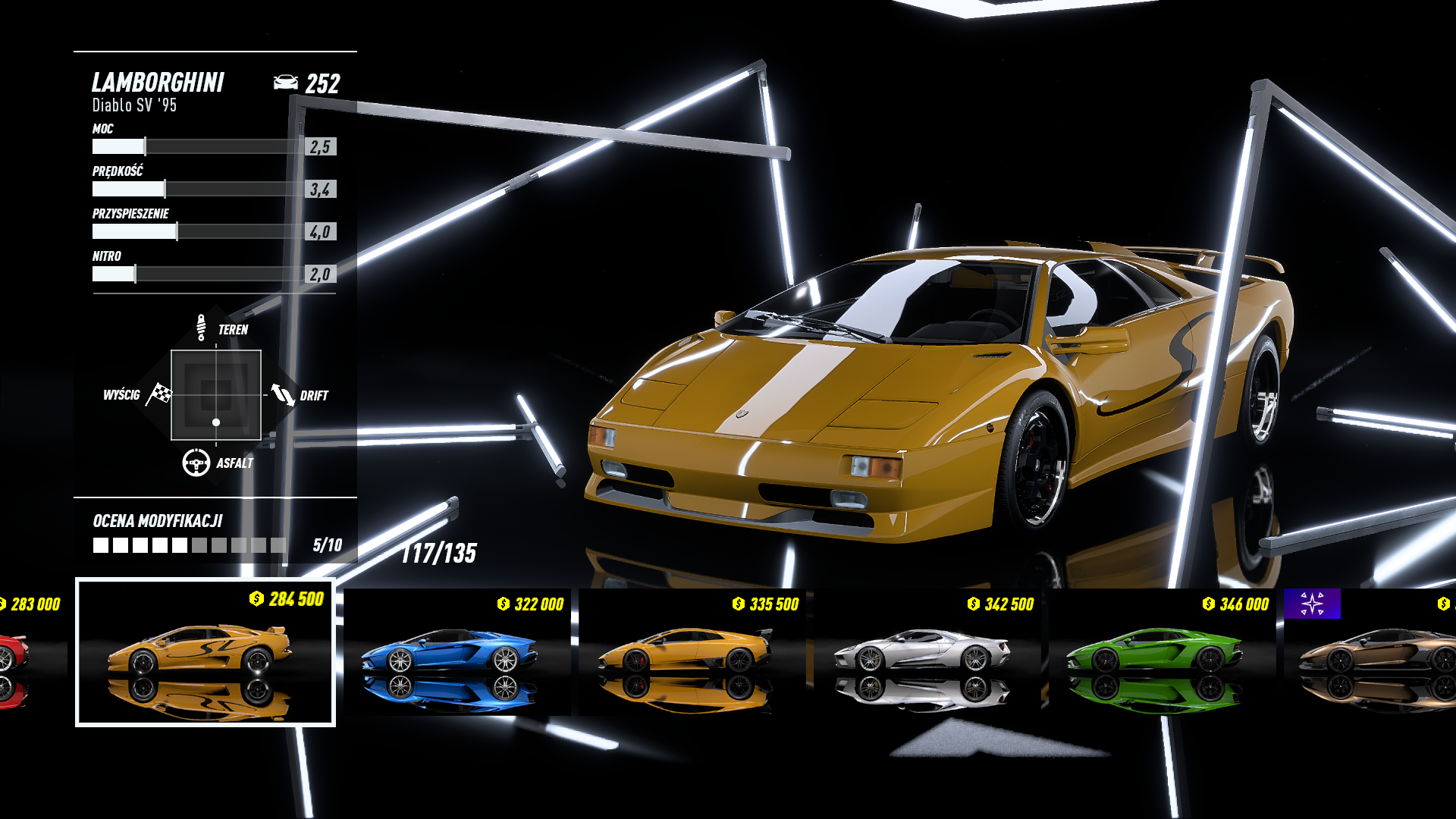 | Lamborghini Diablo SV | 1995 | Supersamochód | 252 | 284,500 | 493 | 1234 | 5/10 | Osiągnij 22 poziom REP | Podstawowa wersja gry | |