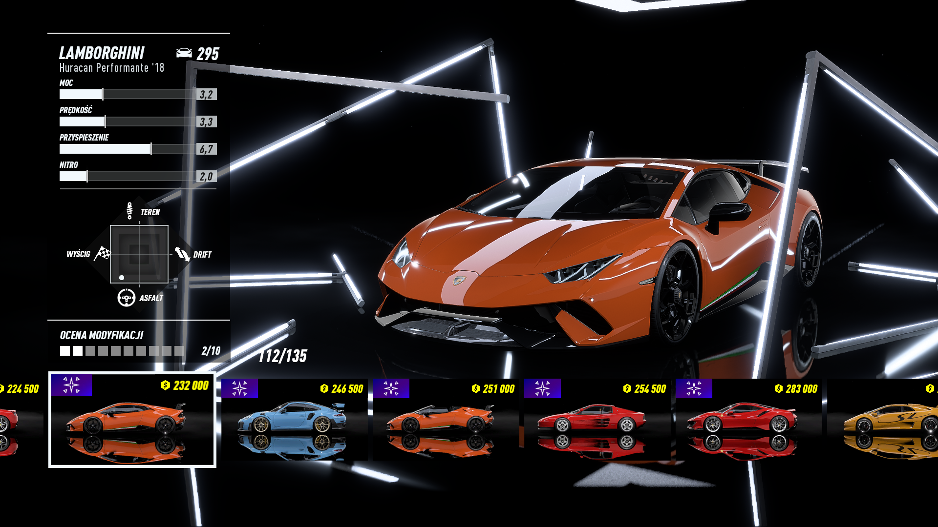 | Lamborghini Huracan Performante | 2018 | Supersamochód | 295 | 232,000 | 631 | 1239 | 2/10 | Osiągnij 28 poziom REP | Podstawowa wersja gry | |