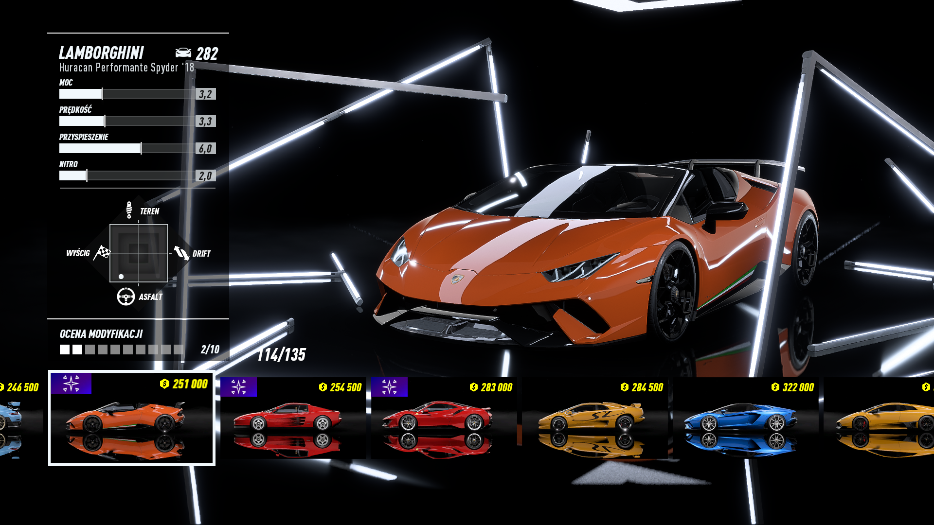 | Lamborghini Huracan Performante Spyder | 2018 | Kabriolet | 282 | 251,000 | 631 | 1239 | 2/10 | Zdobądź 3 gwiazdki we wszystkich skokach | Podstawowa wersja gry | |