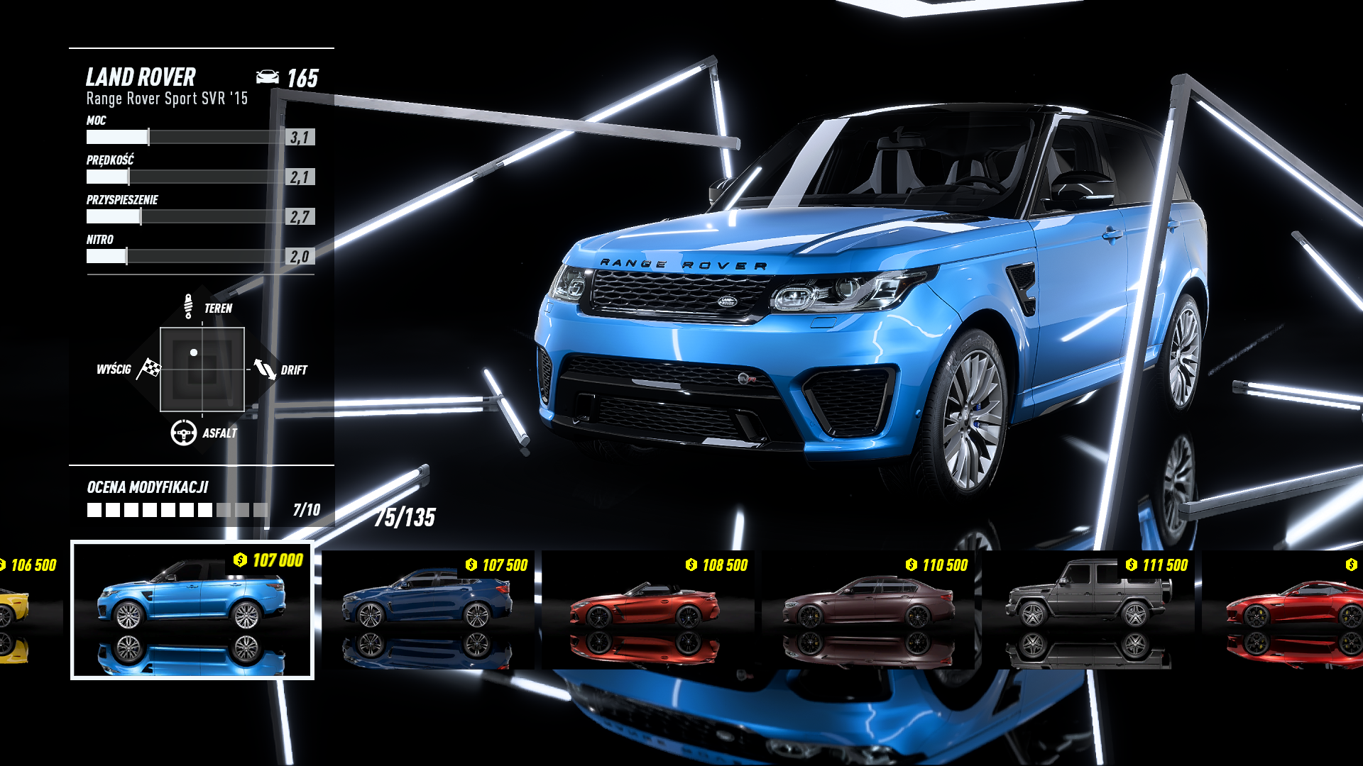 | Land Rover Range Rover Sport SVR | 2015 | SUV | 165 | 107,000 | 543 | 1216 | 7/10 | Osiągnij 8 poziom REP | Podstawowa wersja gry | |