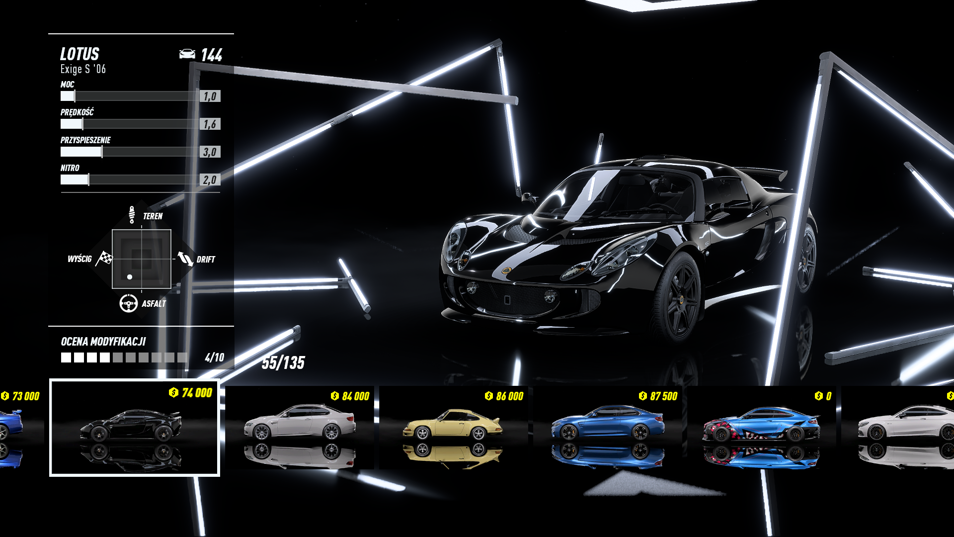 | Lotus Exige S | 2006 | Wyścigowy | 144 | 74,000 | 218 | 535 | 4/10 | Osiągnij 4 poziom REP | Podstawowa wersja gry | |