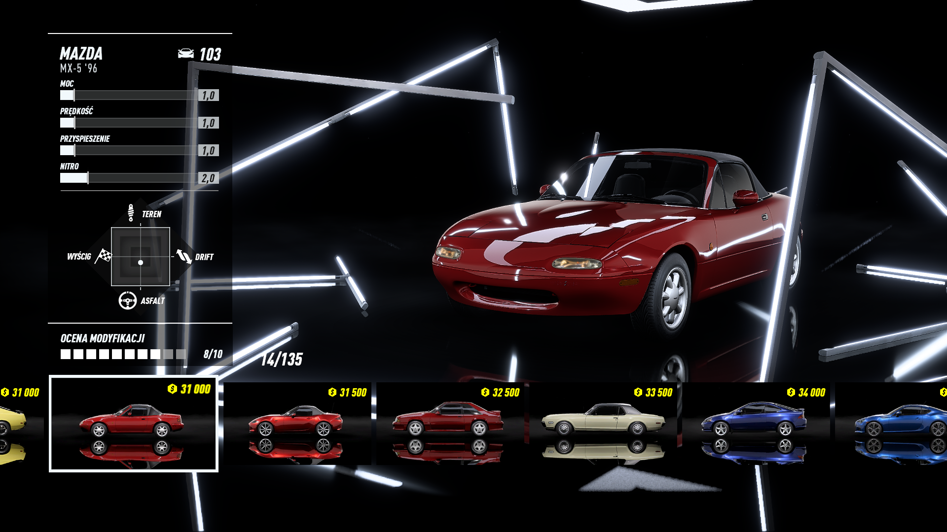 | Mazda MX-5 | 1996 | Kabriolet | 103 | 31,000 | 128 | 546 | 8/10 | Osiągnij 20 poziom REP | Podstawowa wersja gry | |