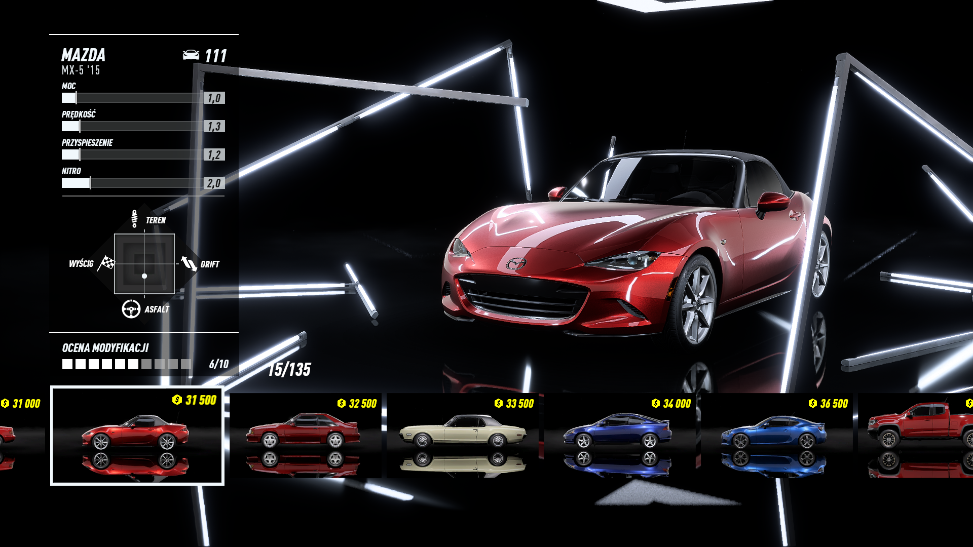 | Mazda MX-5 | 2015 | Kabriolet | 111 | 31,500 | 158 | 584 | 6/10 | Osiągnij 20 poziom REP | Podstawowa wersja gry | |