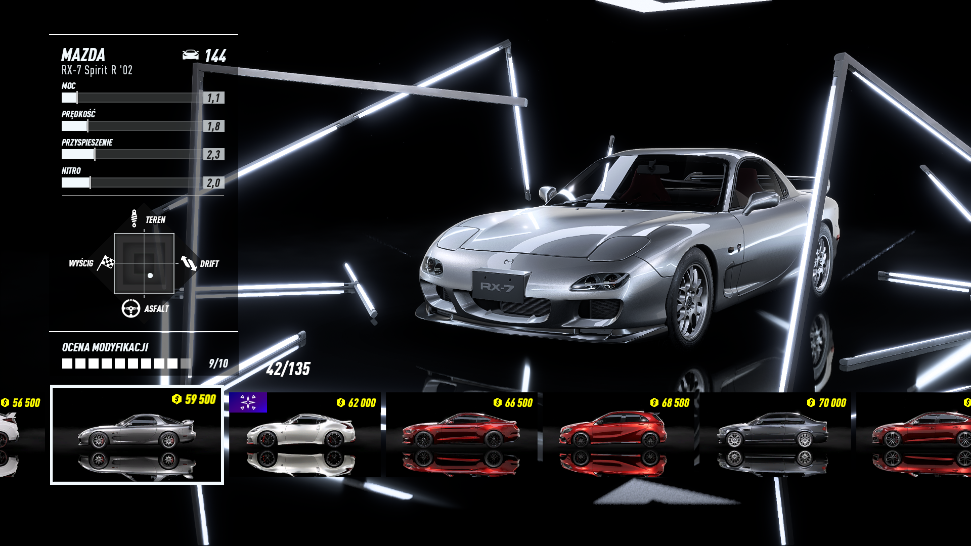 | Mazda RX-7 Spirit R | 2002 | Coupé | 144 | 59,500 | 276 | 725 | 9/10 | Osiągnij 4 poziom REP | Podstawowa wersja gry | |