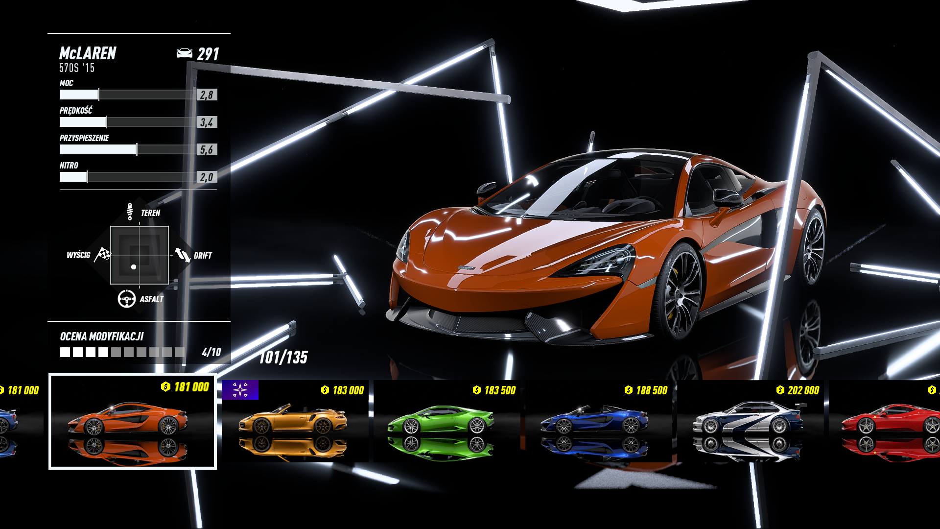 | McLaren 570S | 2015 | Supersamochód | 291 | 181,000 | 562 | 1010 | 4/10 | Osiągnij 28 poziom REP | Podstawowa wersja gry | |