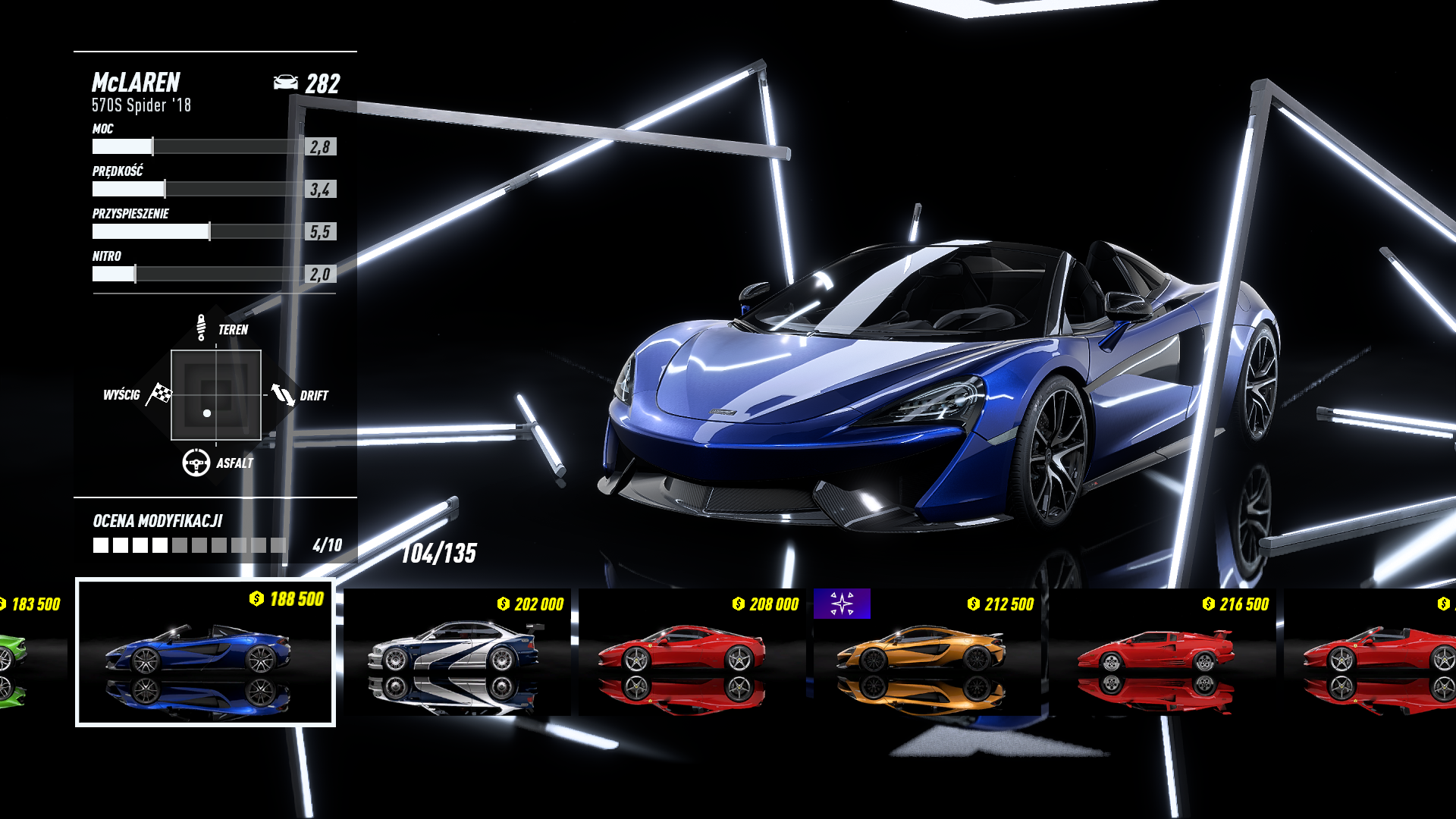 | McLaren 570S Spider | 2018 | Kabriolet | 282 | 188,500 | 562 | 1010 | 4/10 | Osiągnij 28 poziom REP | Podstawowa wersja gry | |