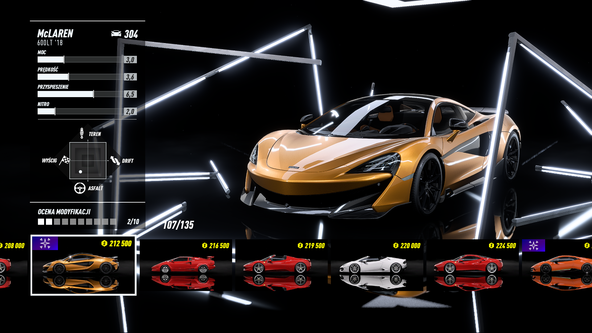 | McLaren 600LT | 2018 | Supersamochód | 304 | 212,500 | 591 | 1048 | 2/10 | Zdobądź 3 gwiazdki na wszystkich fotoradarach | Podstawowa wersja gry | |