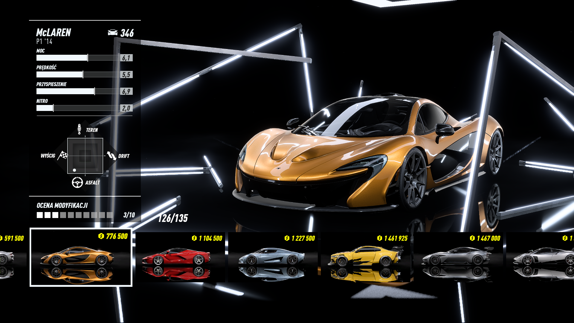 | McLaren P1 | 2014 | Hipersamochód | 346 | 776,500 | 903 | 1232 | 7/10 | Osiągnij 40 poziom REP | Podstawowa wersja gry | |
