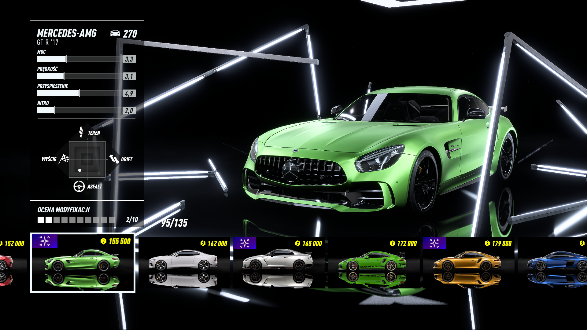 | Mercedes-AMG GT R | 2017 | Sportowy | 270 | 155,500 | 577 | 1033 | 2/10 | Osiągnij 24 poziom REP | Podstawowa wersja gry | |