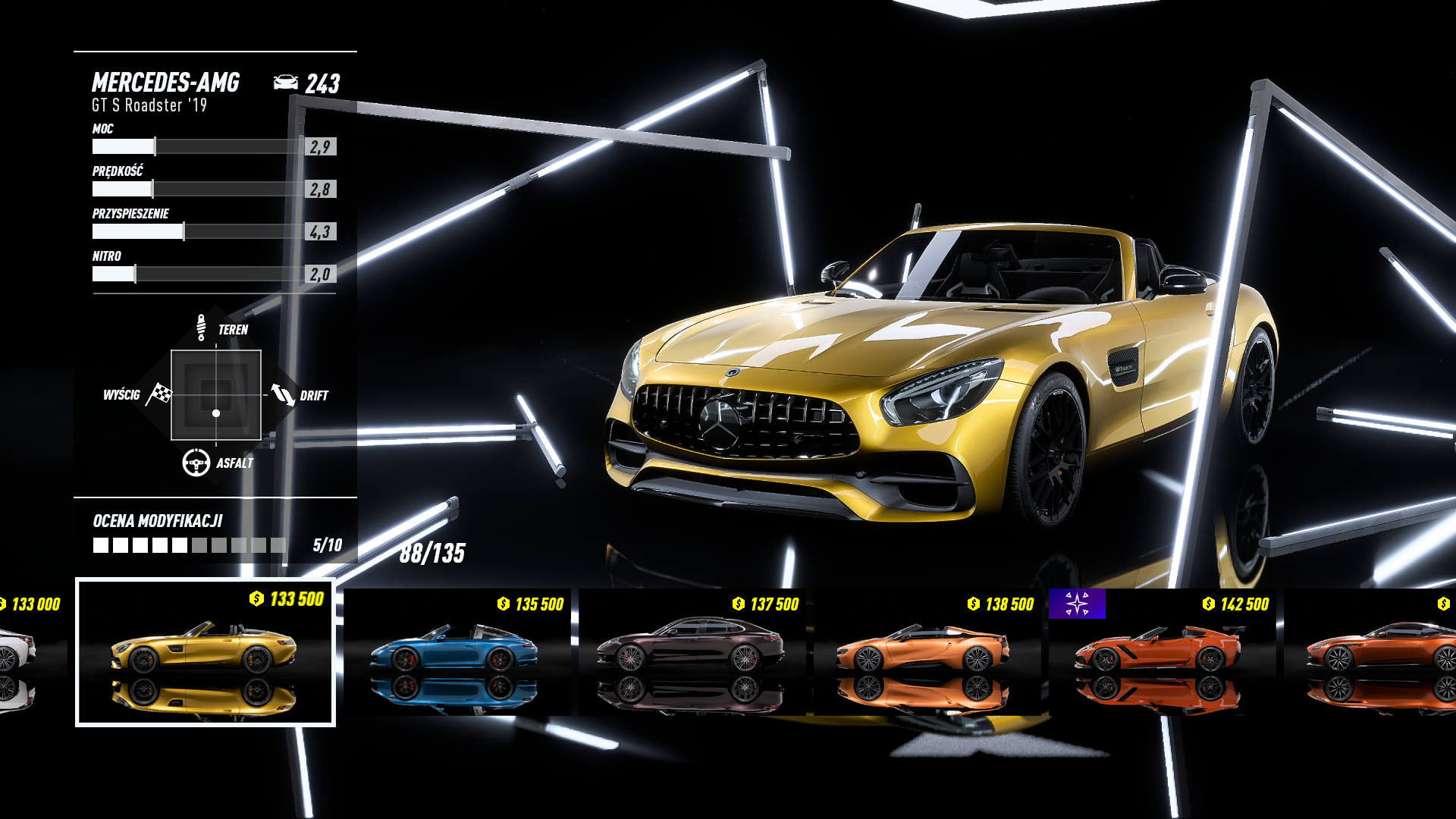 | Mercedes-AMG GT S Roadster | 2019 | Kabriolet | 243 | 133,500 | 515 | 1014 | 5/10 | Osiągnij 22 poziom REP | Podstawowa wersja gry | |