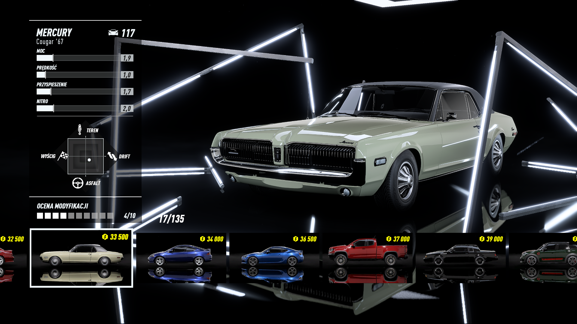 | Mercury Cougar | 1967 | Klasyczny | 117 | 33,500 | 335 | 1239 | 4/10 | Osiągnij 14 poziom REP | Podstawowa wersja gry | |