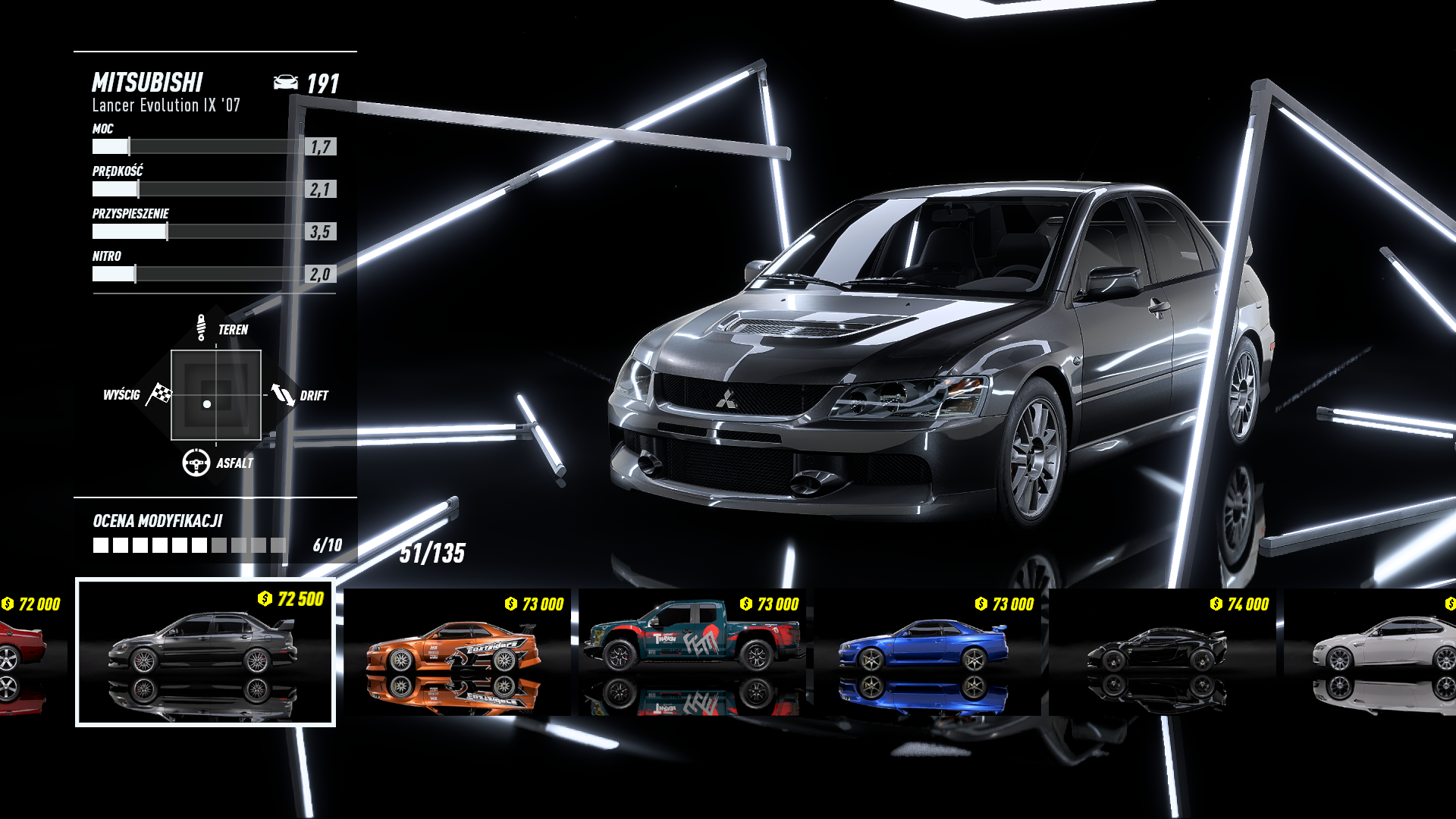 | Mitsubishi Lancer Evolution IX | 2007 | Rajdowy | 191 | 72,500 | 366 | 662 | 6/10 | Osiągnij 16 poziom REP | Podstawowa wersja gry | |