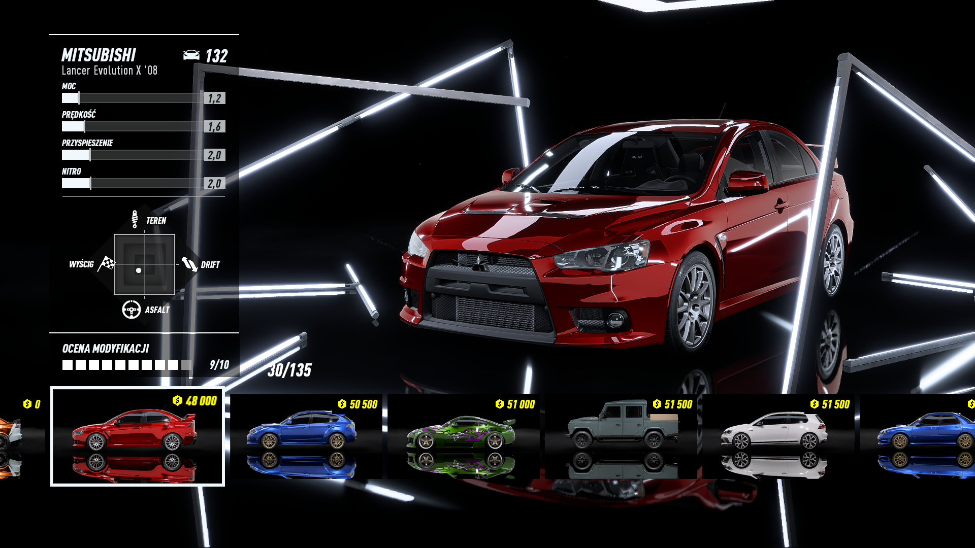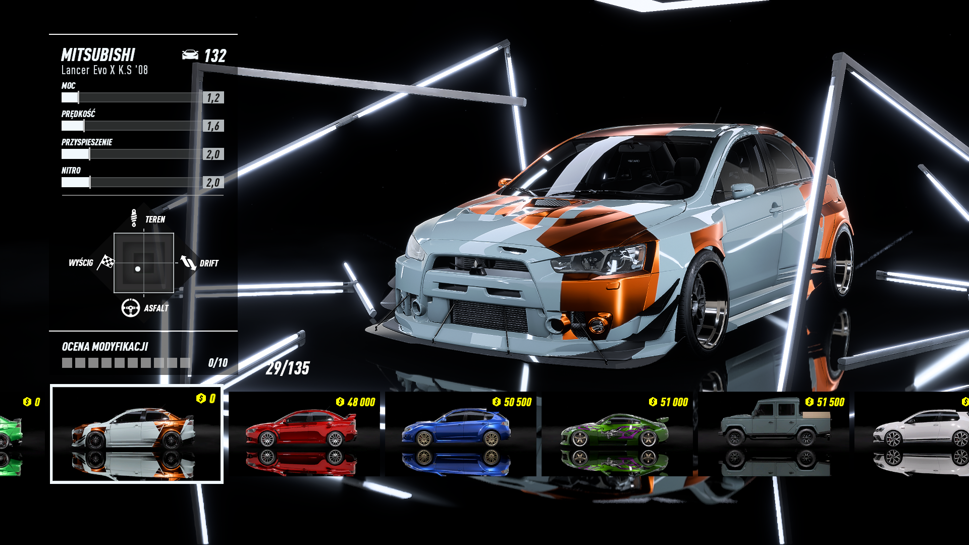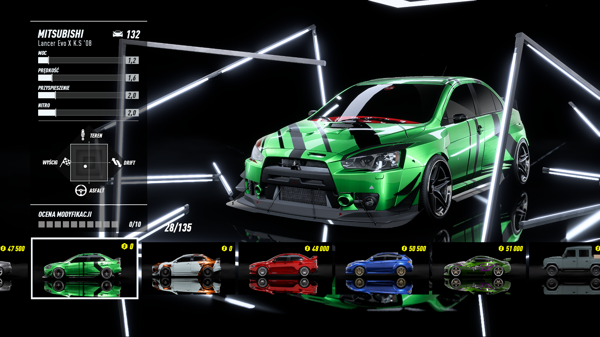 | Mitsubishi Lancer Evolution X | 2008 | Rajdowy | 132 | 48,000 | 291 | 918 | 10/10 | Osiągnij 14 poziom REP | Podstawowa wersja gry | |