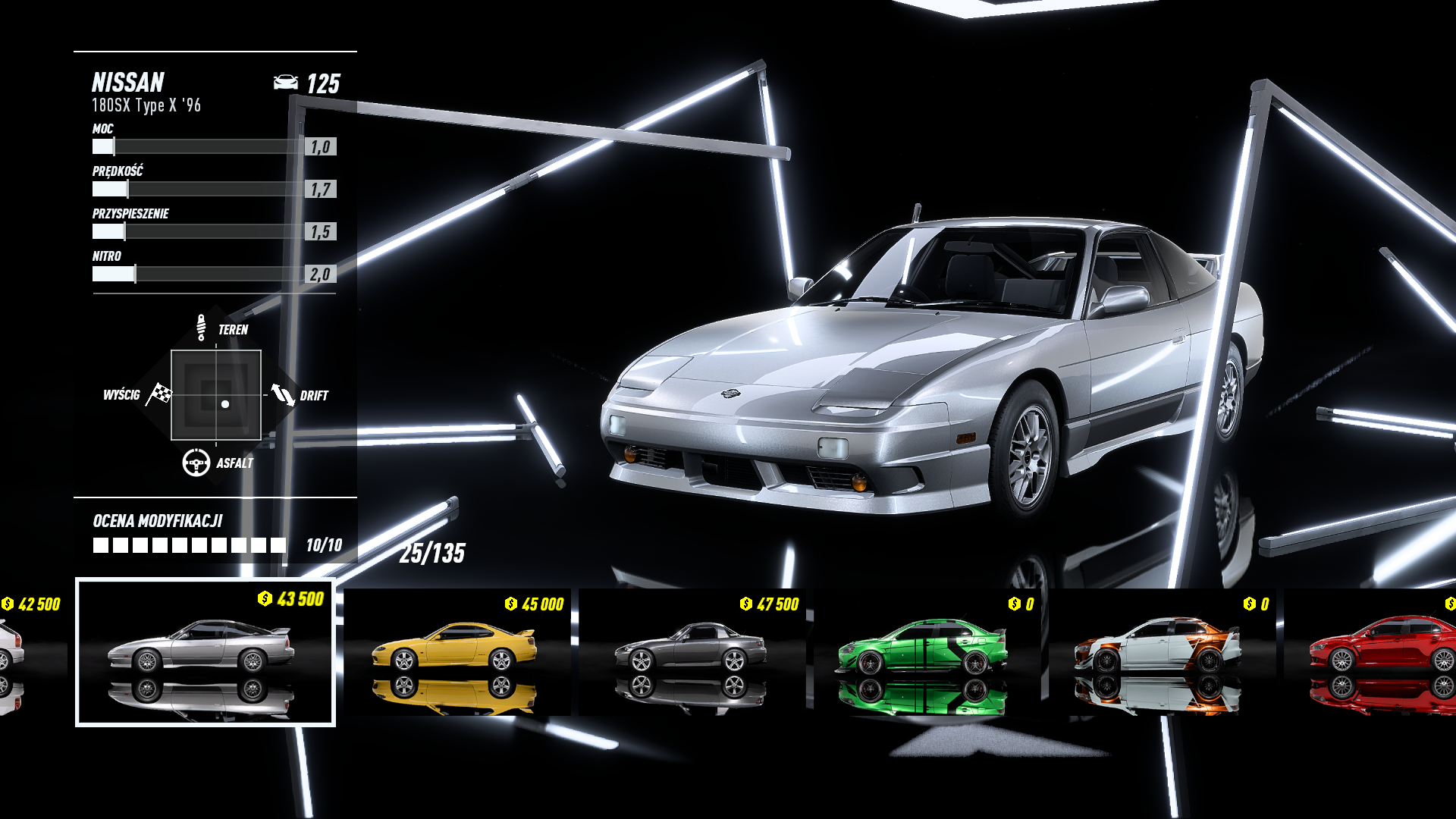 | Nissan 180SX Type X | 1996 | Coupé | 125 | 43,500 | 203 | 585 | 10/10 | Osiągnij 14 poziom REP | Podstawowa wersja gry | |