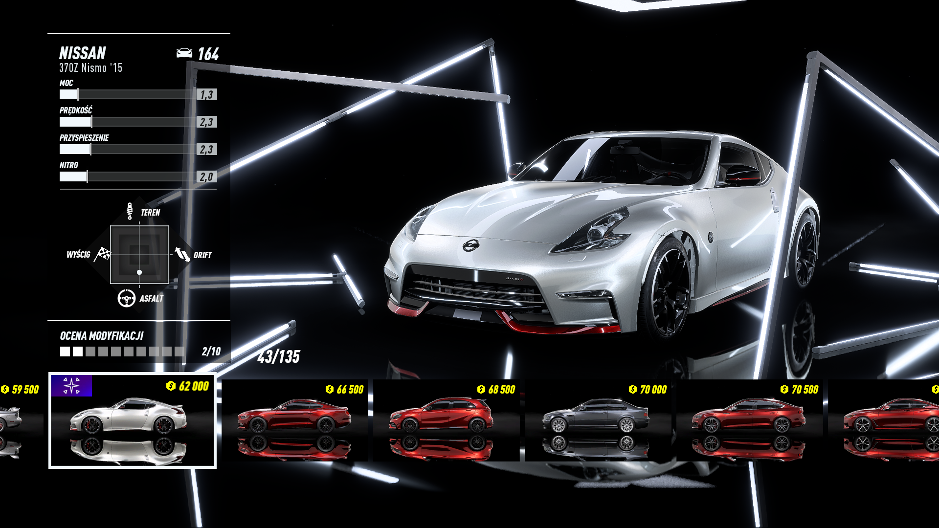 | Nissan 370Z Nismo | 2015 | Coupé | 164 | 165,000 | 350 | 955 | 2/10 | Zbierz wszystkie graffiti | Podstawowa wersja gry | |