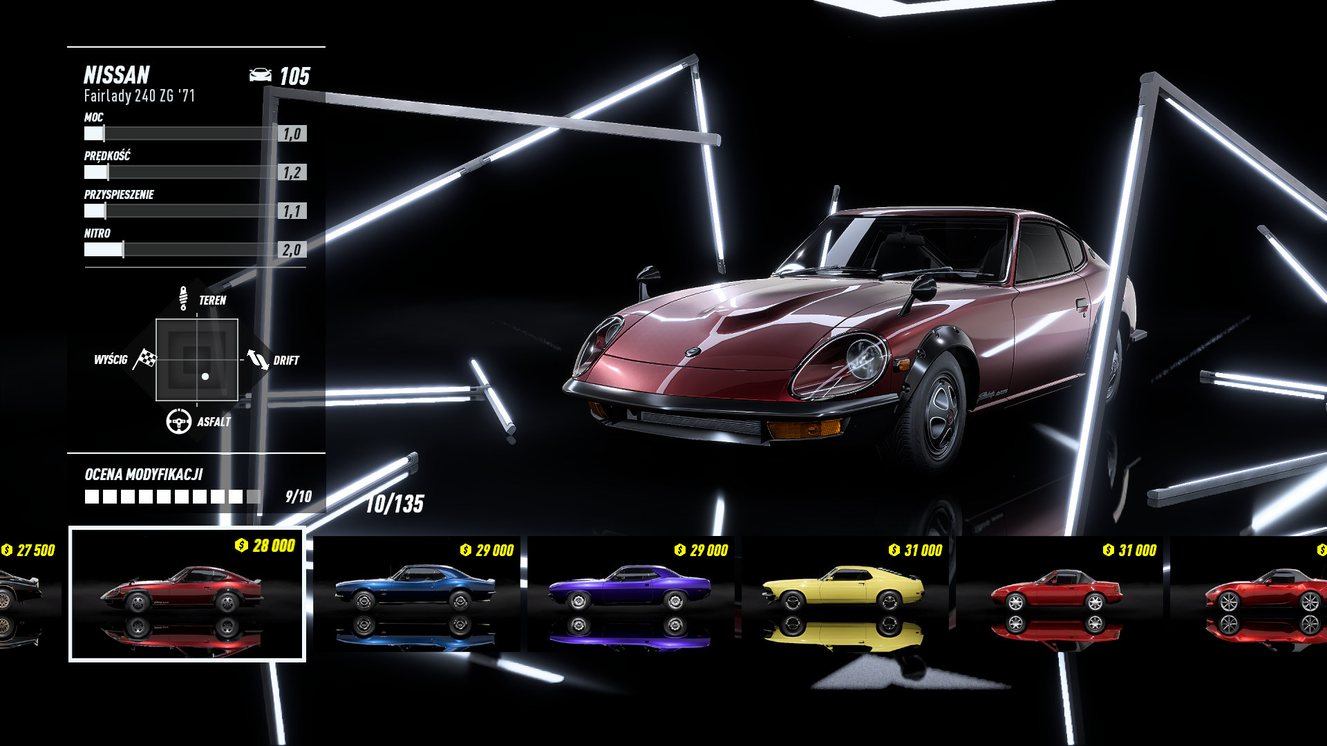 | Nissan Fairlady 240 ZG | 1971 | Coupé | 105 | 28,000 | 147 | 674 | 9/10 | Osiągnij 12 poziom REP | Podstawowa wersja gry | |