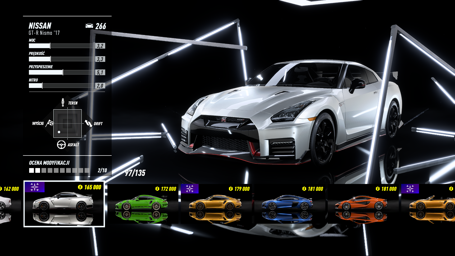 | Nissan GT-R Nismo | 2017 | Supersamochód | 266 | 165,000 | 591 | 1068 | 2/10 | Rozbij wszystkie billboardy | Podstawowa wersja gry | |