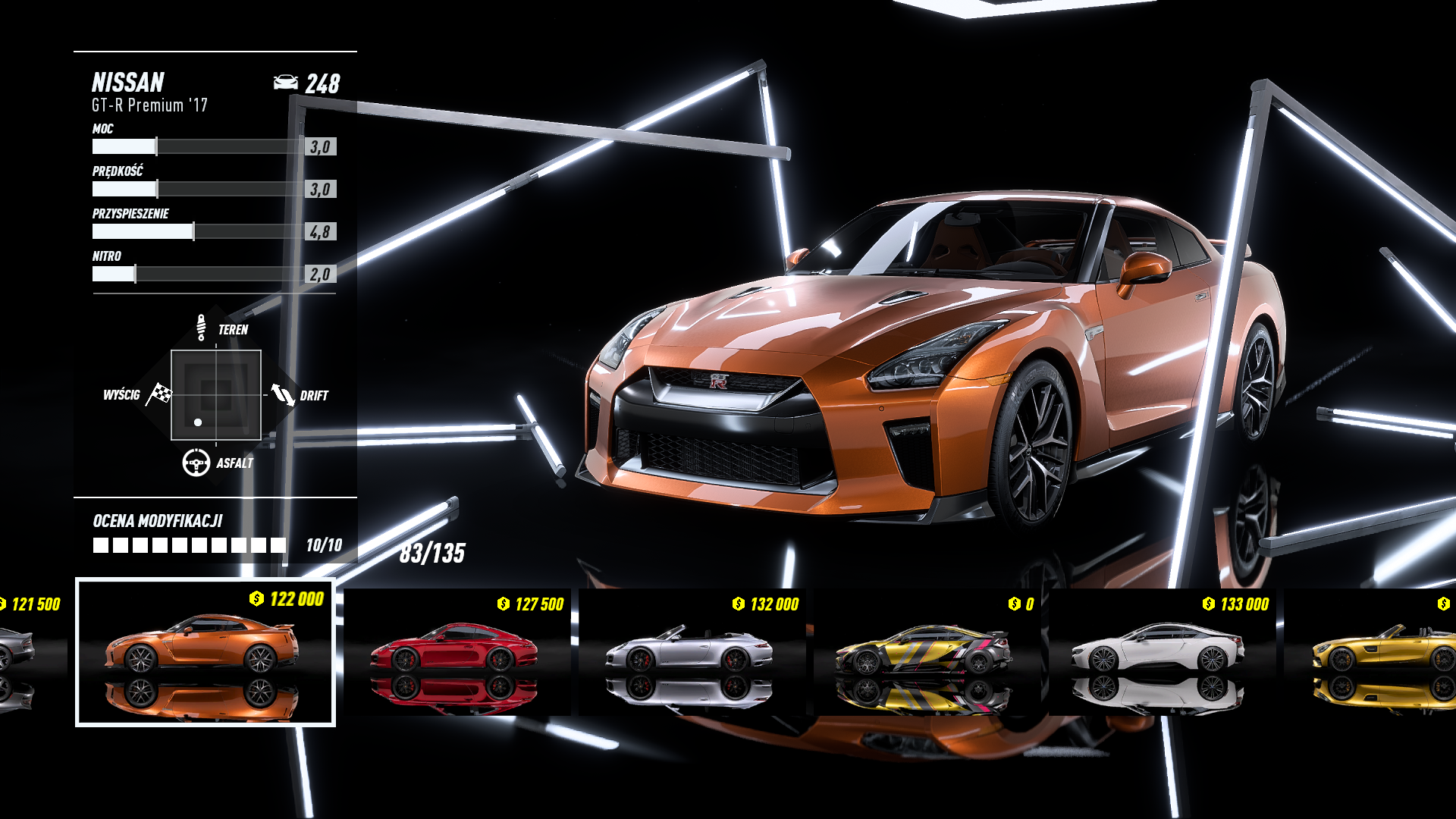 | Nissan GT-R Premium | 2017 | Supersamochód | 248 | 122,000 | 562 | 1008 | 10/10 | Osiągnij 20 poziom REP | Podstawowa wersja gry | |
