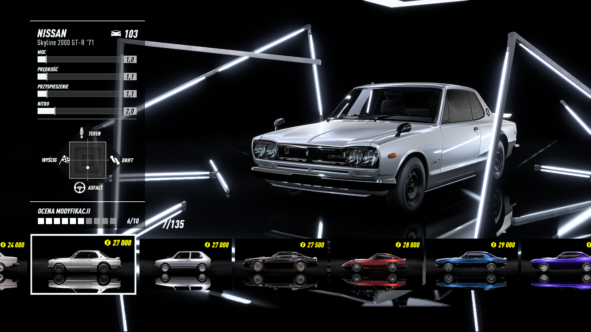 | Nissan Skyline 2000 GT-R | 1971 | Coupé | 103 | 27,000 | 158 | 582 | 6/10 | Osiągnij 20 poziom REP | Podstawowa wersja gry | |