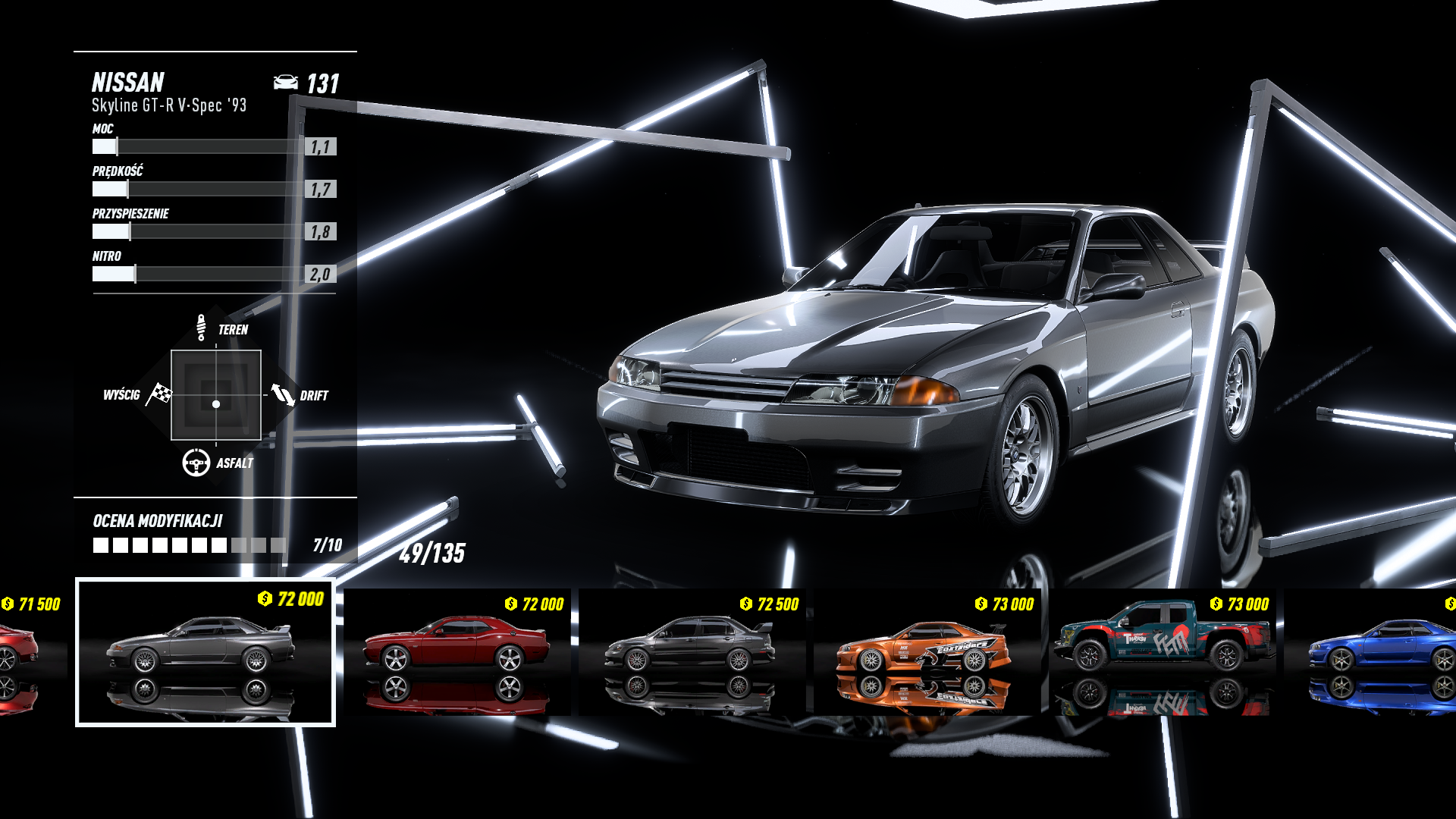 | Nissan Skyline GT-R V·Spec | 1993 | Coupé | 131 | 72,000 | 276 | 713 | 7/10 | Osiągnij 14 poziom REP | Podstawowa wersja gry | |