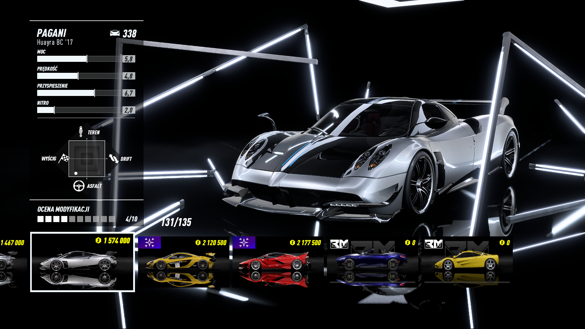 | Pagani Huayra BC | 2017 | Hipersamochód | 338 | 1,574,000 | 754 | 1230 | 4/10 | Osiągnij 36 poziom REP | Podstawowa wersja gry | |