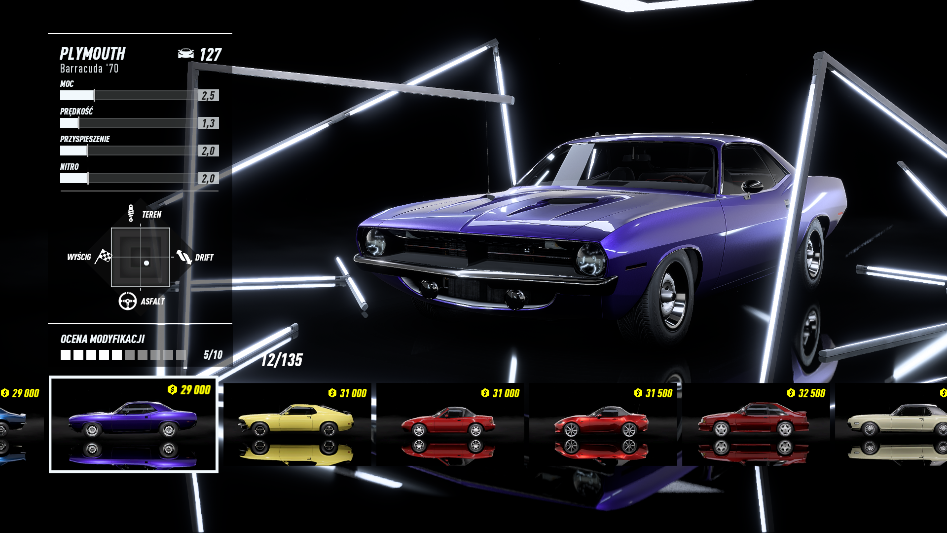 | Plymouth Barracuda | 1970 | Klasyczny | 127 | 29,000 | 390 | 1239 | 5/10 | Dostępny od początku | Podstawowa wersja gry | |