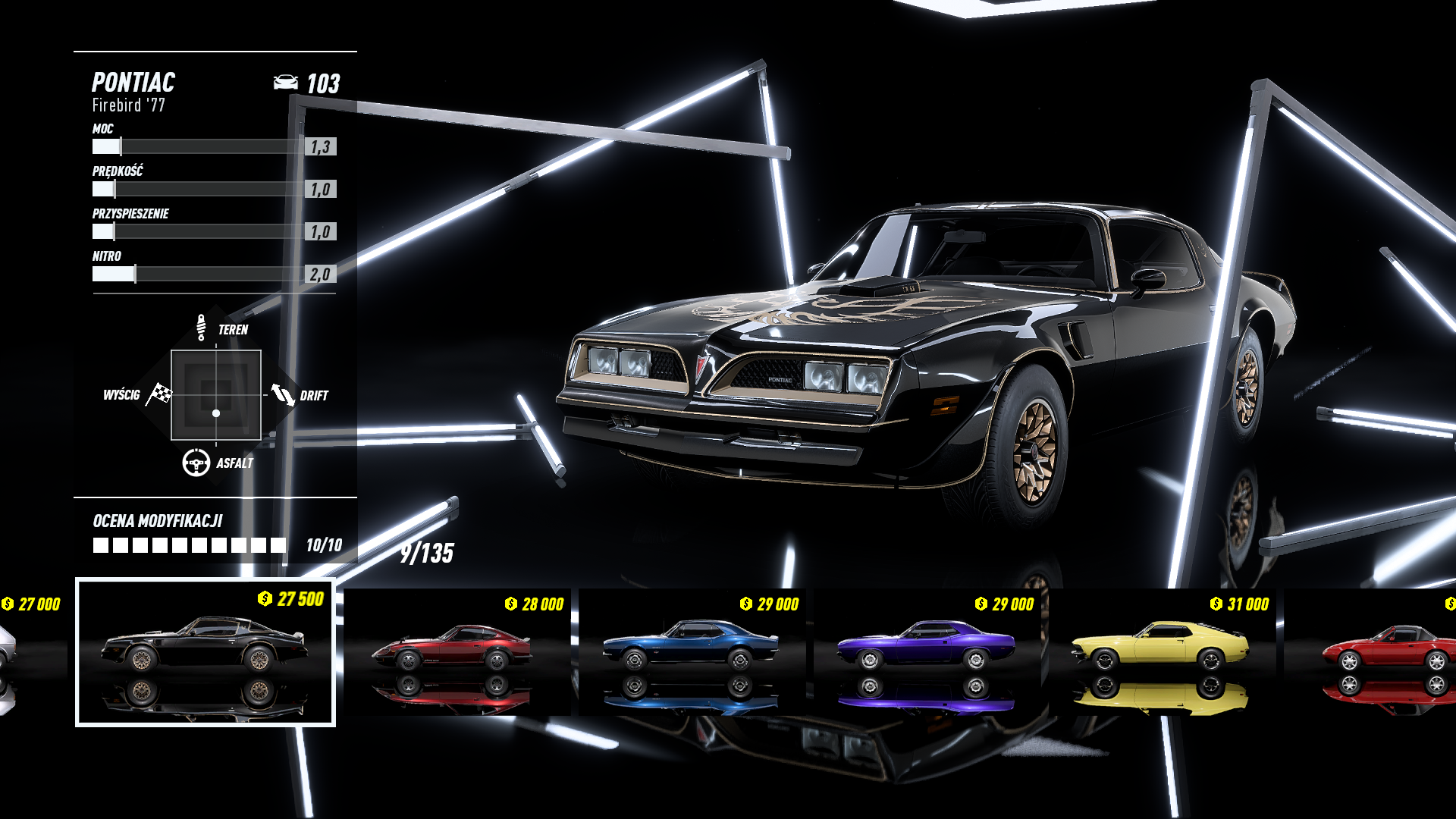 | Pontiac Firebird | 1977 | Klasyczny | 103 | 27,500 | 200 | 1239 | 10/10 | Osiągnij 12 poziom REP | Podstawowa wersja gry | |