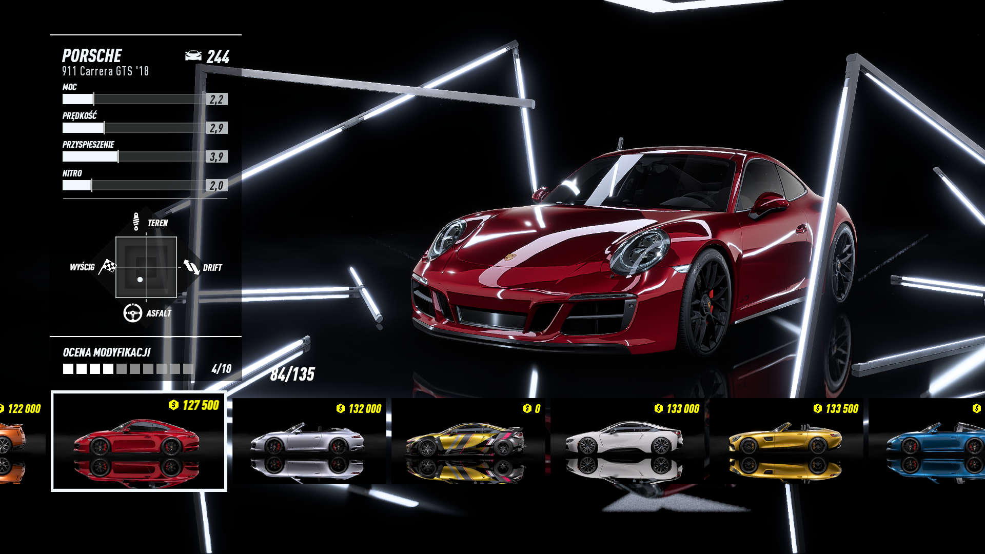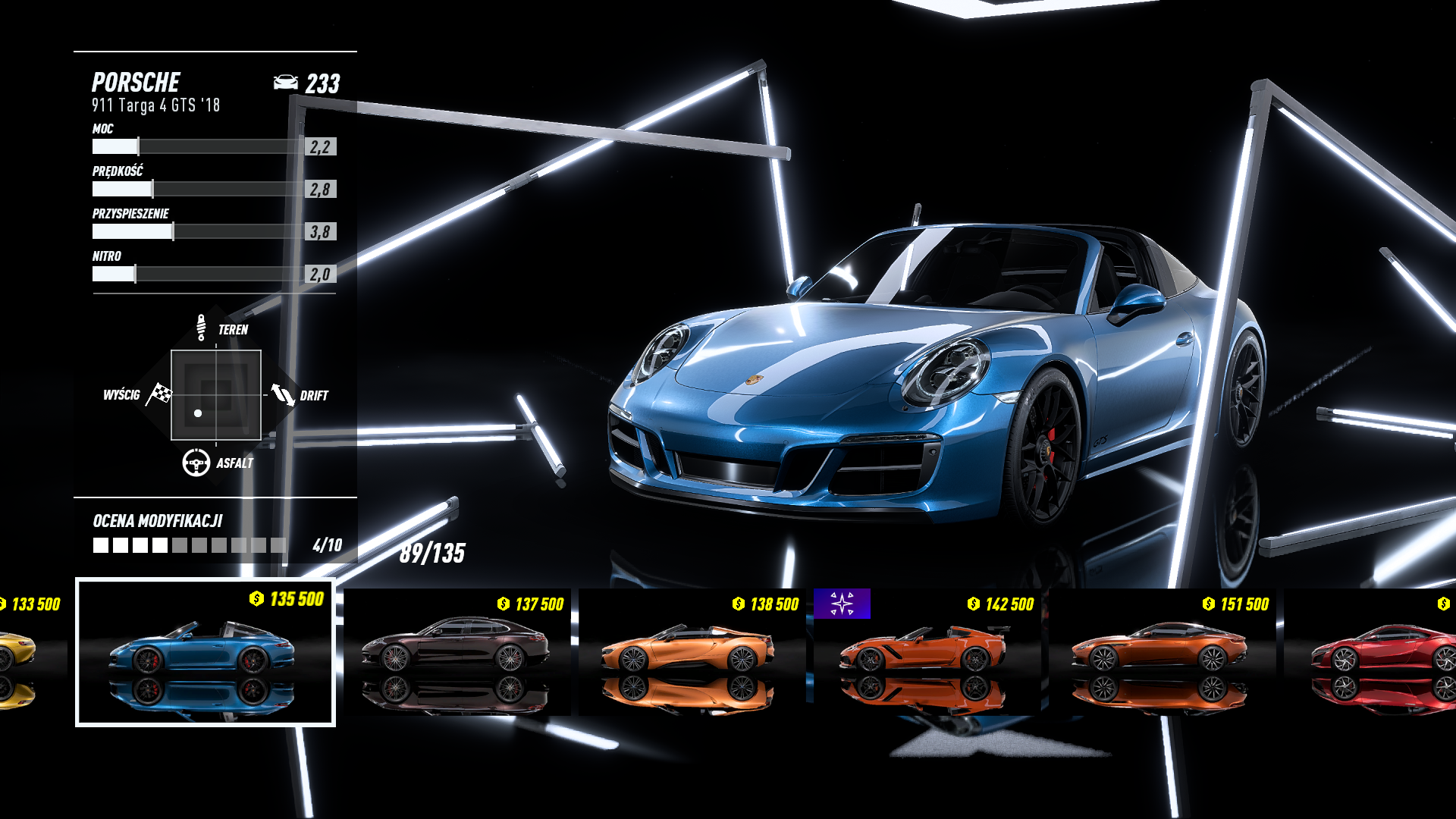 | Porsche 911 Targa 4 GTS | 2018 | Sportowy | 233 | 135,500 | 444 | 802 | 4/10 | Osiągnij 22 poziom REP | Podstawowa wersja gry | |