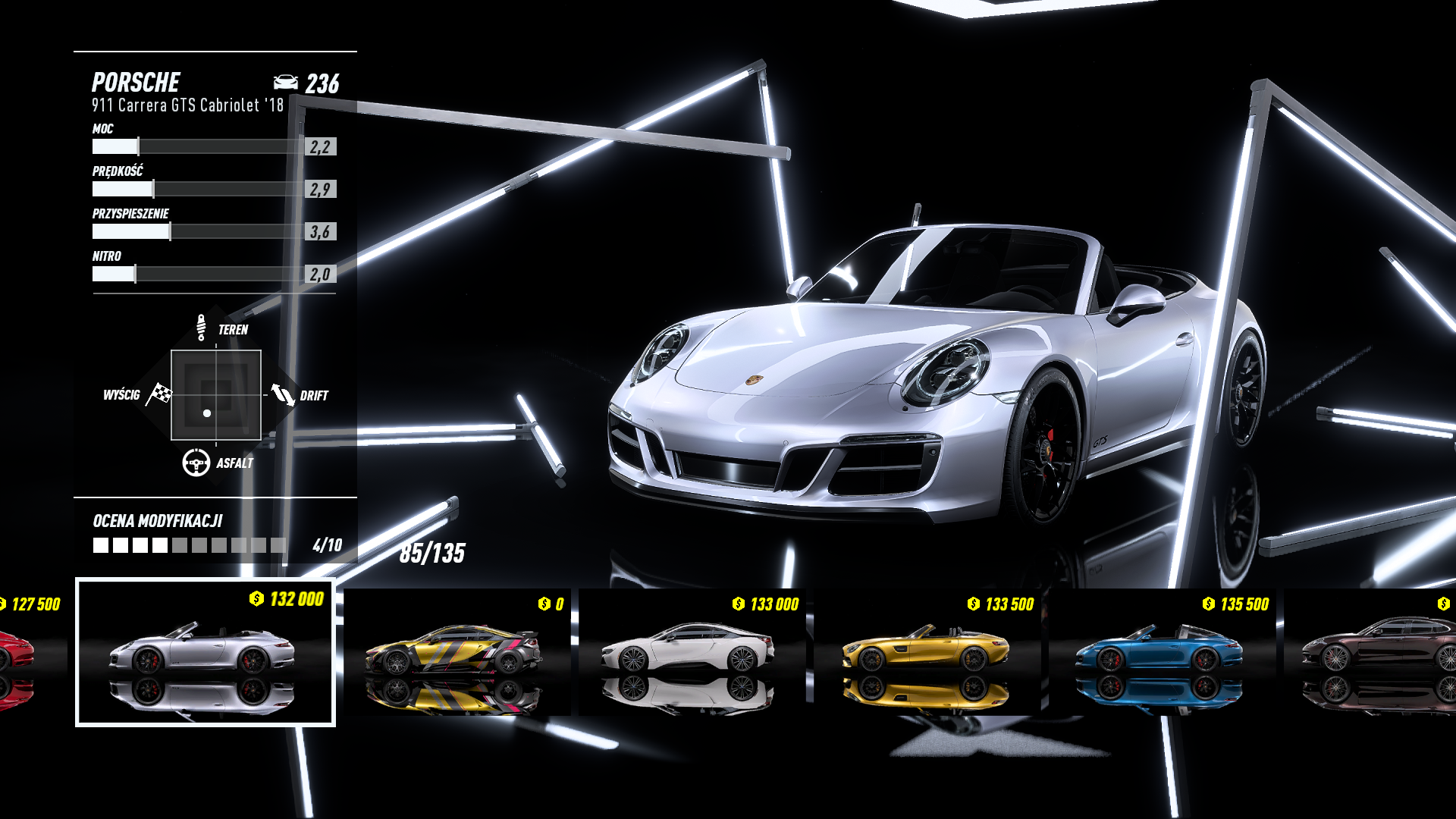 | Porsche 911 Carrera GTS Cabriolet | 2018 | Kabriolet | 236 | 132,000 | 444 | 802 | 4/10 | Osiągnij 22 poziom REP | Podstawowa wersja gry | |