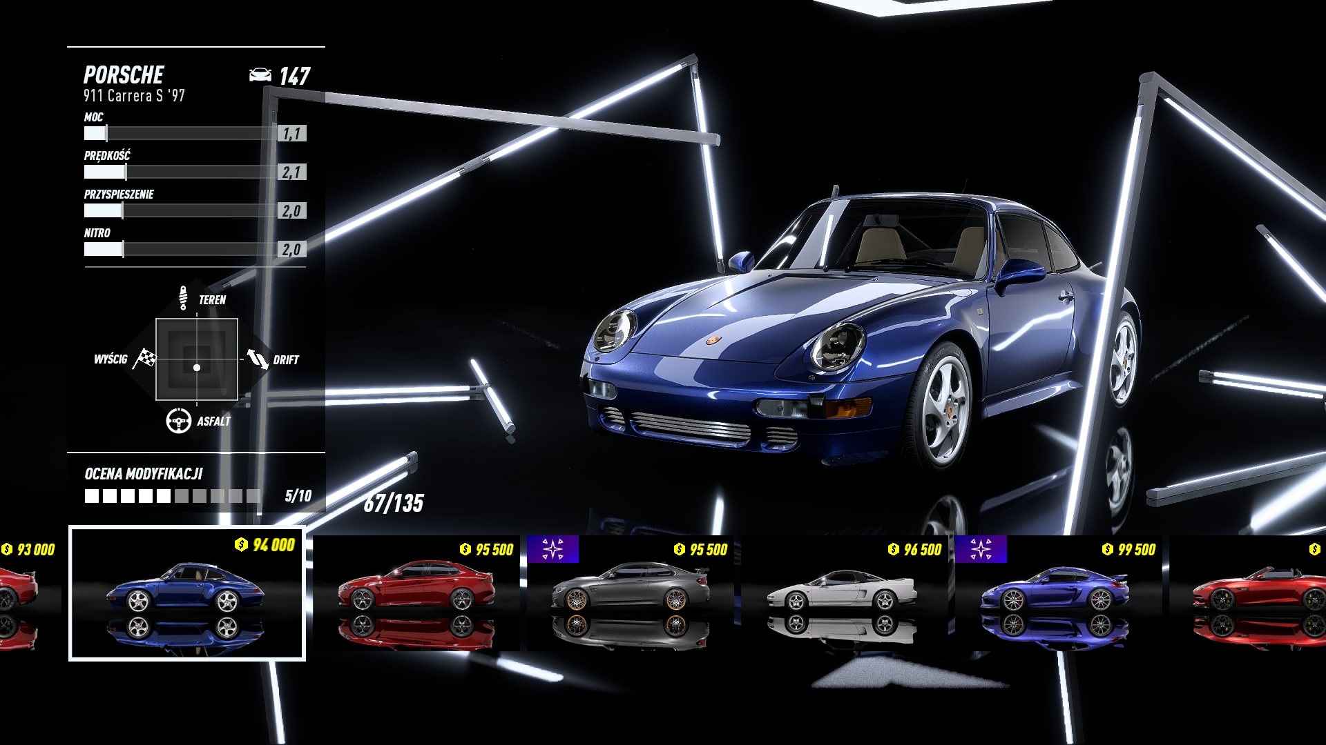 | Porsche 911 Carrera S | 1997 | Sportowy | 147 | 94,000 | 282 | 936 | 5/10 | Osiągnij 18 poziom REP | Podstawowa wersja gry | |