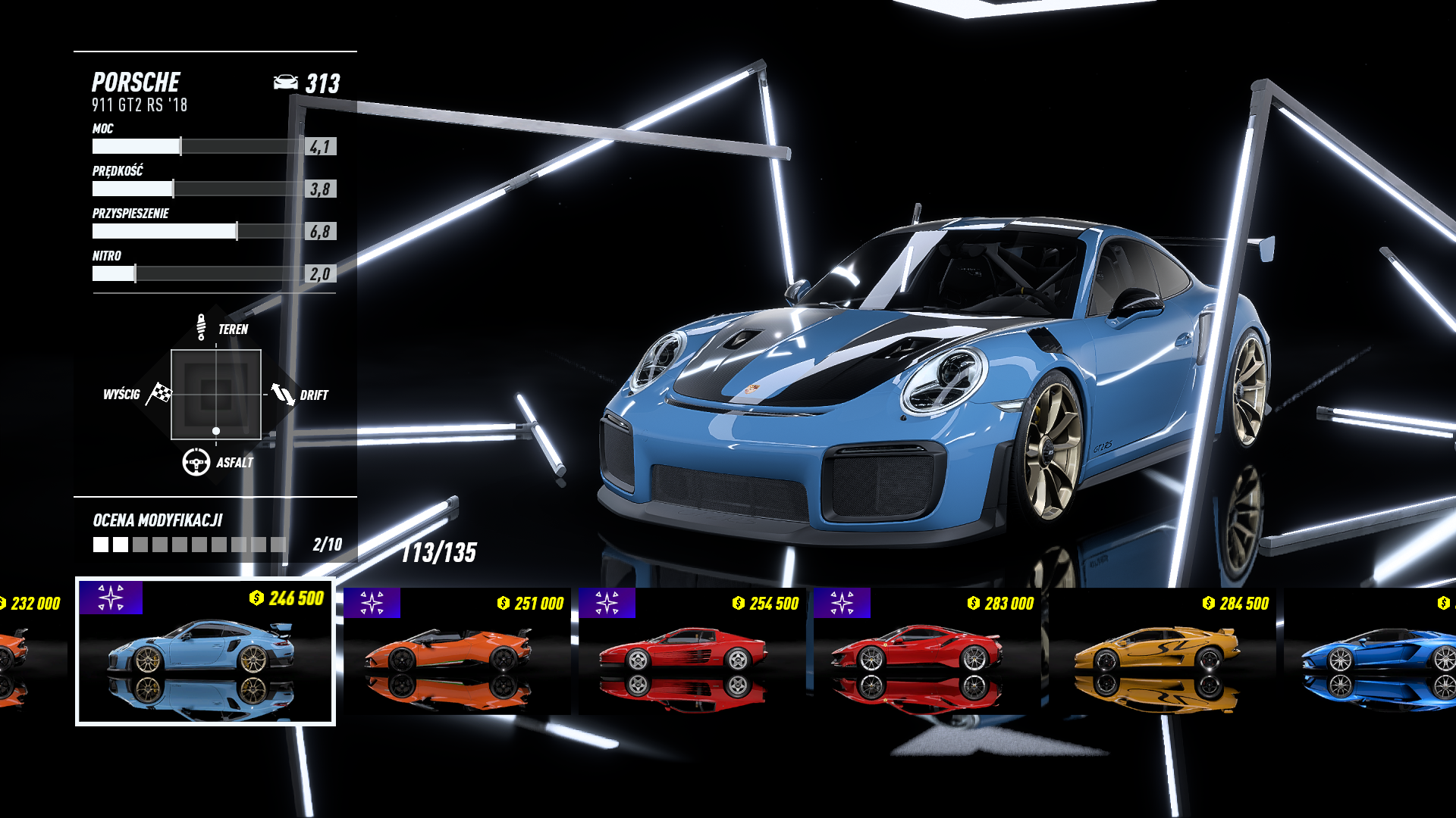 | Porsche 911 GT2 RS | 2018 | Supersamochód | 313 | 246,500 | 691 | 1237 | 2/10 | Osiągnij 32 poziom REP | Podstawowa wersja gry | |
