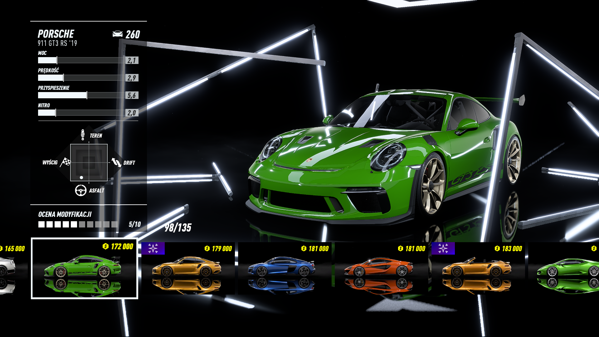 | Porsche 911 GT3 RS | 2019 | Sportowy | 260 | 172,000 | 514 | 1017 | 5/10 | Osiągnij 24 poziom REP | Podstawowa wersja gry | |