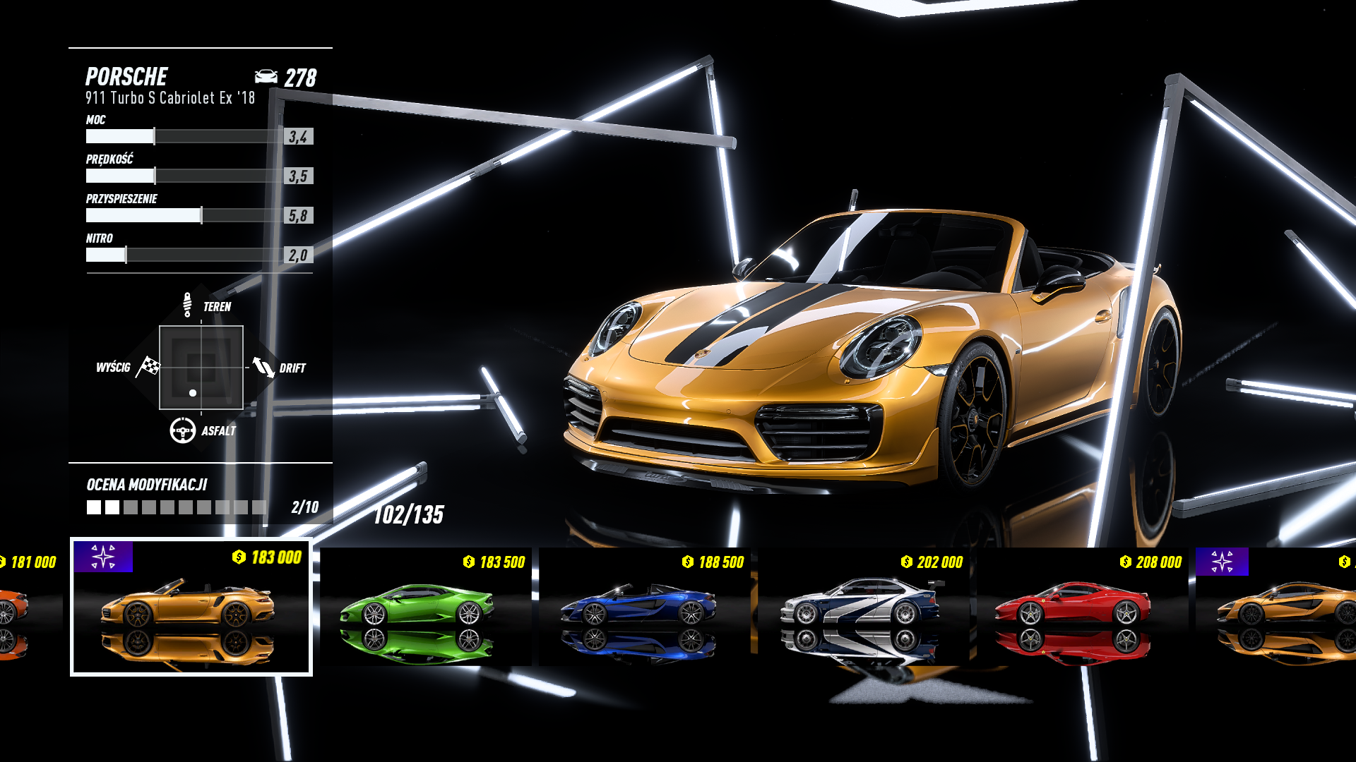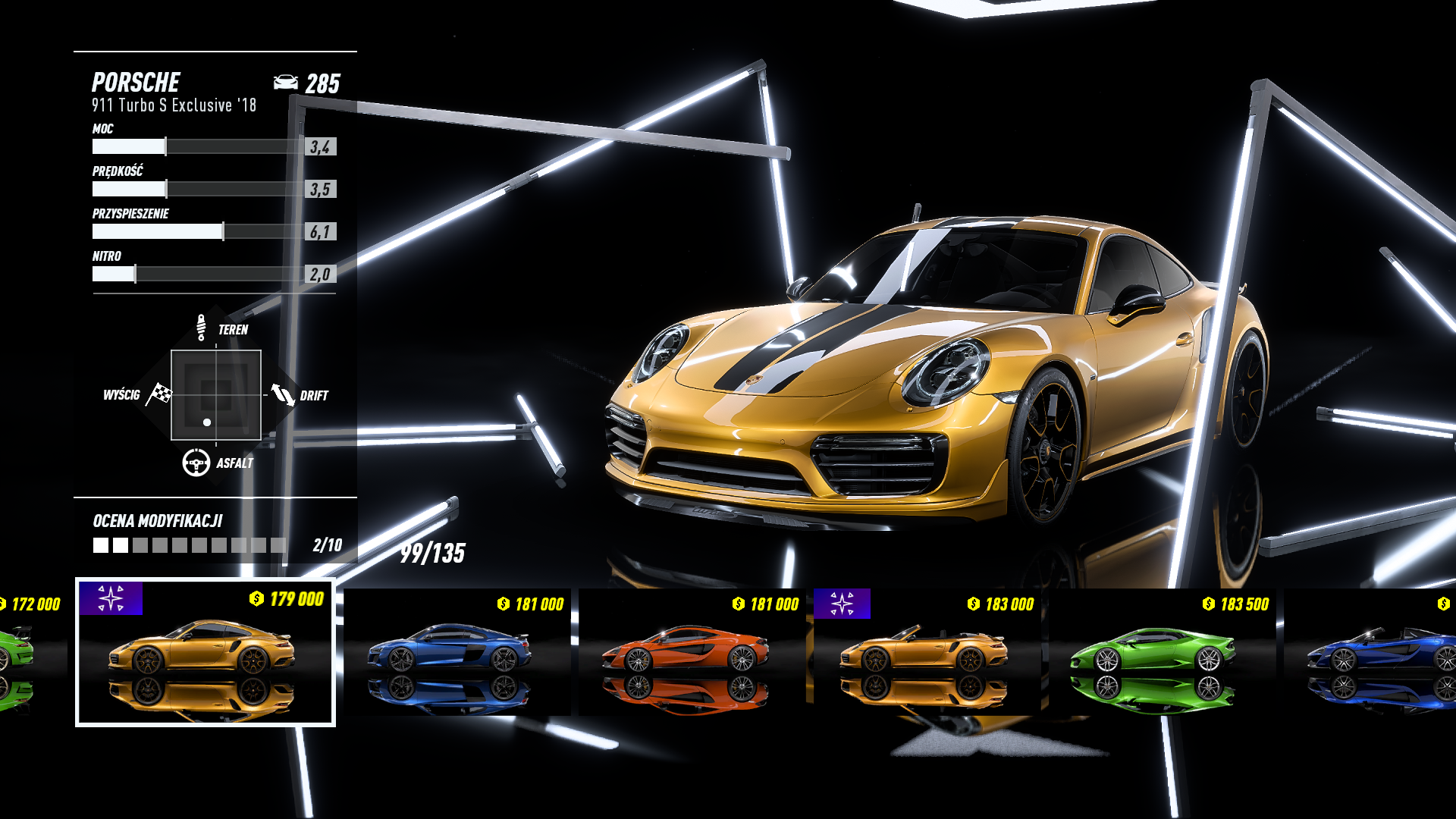 | Porsche 911 Turbo S Cabriolet Ex | 2018 | Kabriolet | 278 | 183,000 | 599 | 1069 | 2/10 | Osiągnij 24 poziom REP | Podstawowa wersja gry | |