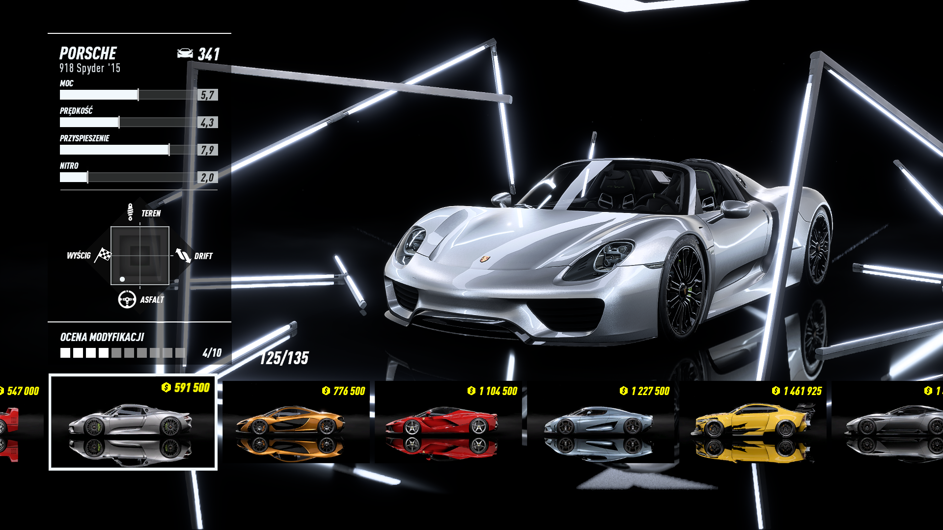 | Porsche 918 Spyder | 2015 | Hipersamochód | 341 | 591,500 | 868 | 1229 | 4/10 | Osiągnij 36 poziom REP | Podstawowa wersja gry | |