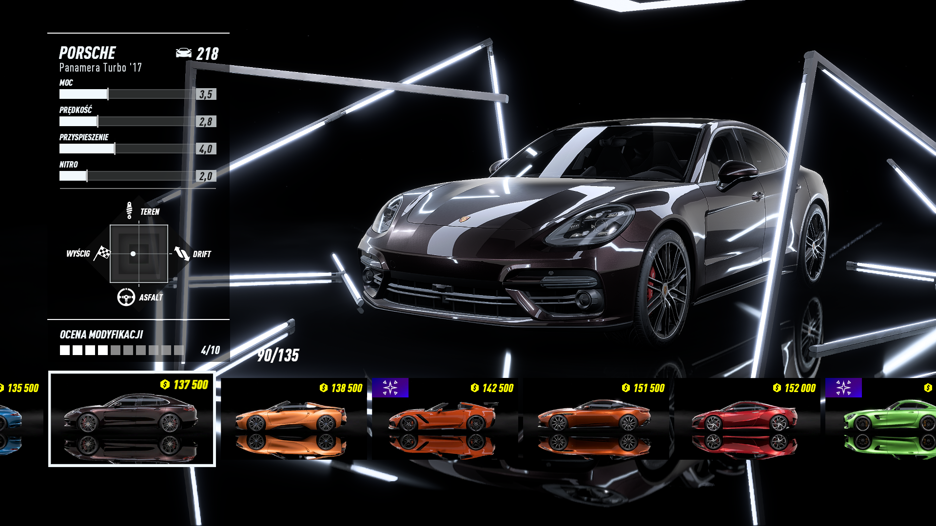 | Porsche Panamera Turbo | 2017 | Wyczynowy | 218 | 137,500 | 542 | 1017 | 4/10 | Osiągnij 18 poziom REP | Podstawowa wersja gry | |