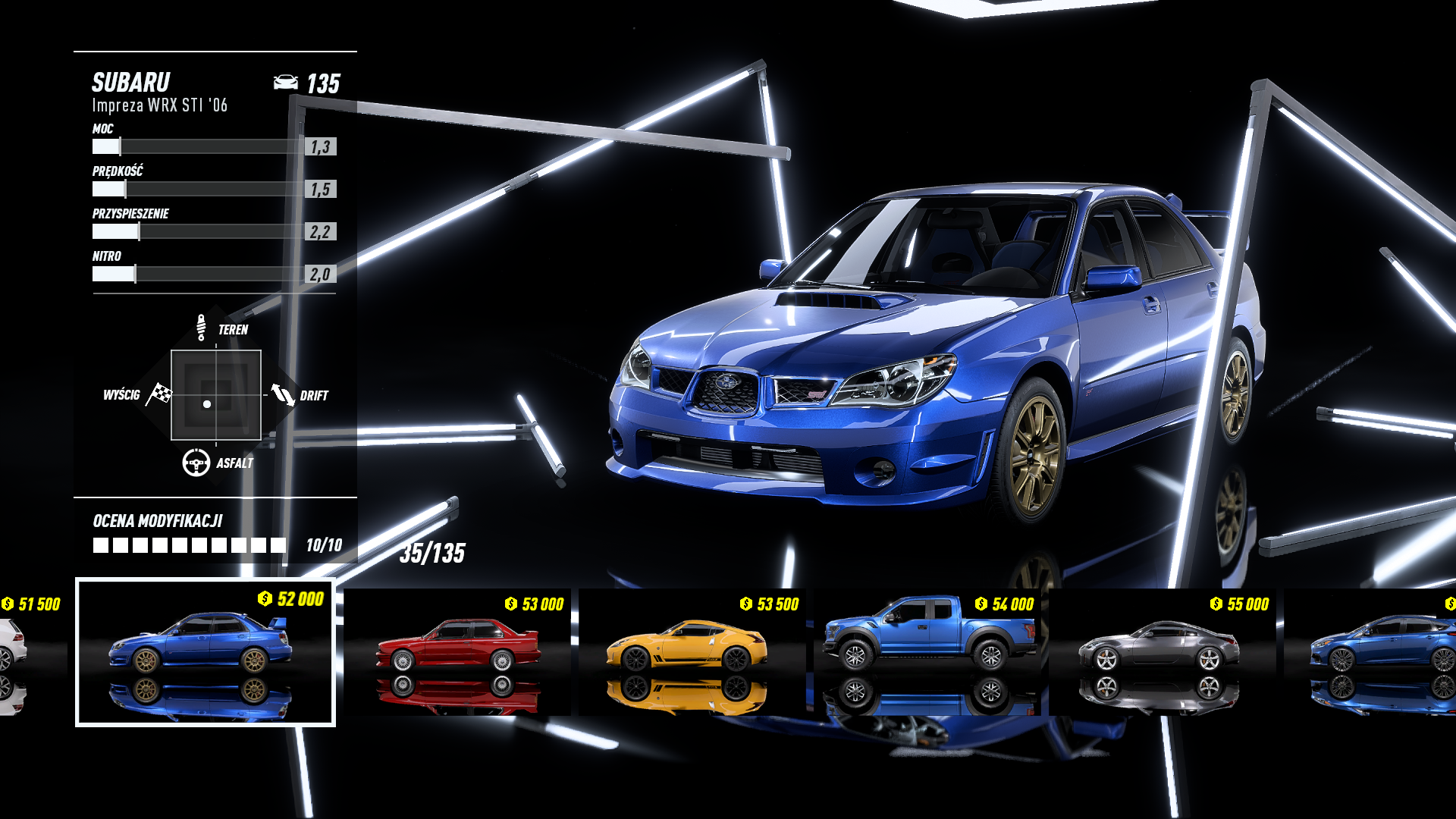 | Subaru Impreza WRX STI | 2006 | Rajdowy | 135 | 52,000 | 300 | 690 | 10/10 | Osiągnij 20 poziom REP | Podstawowa wersja gry | |